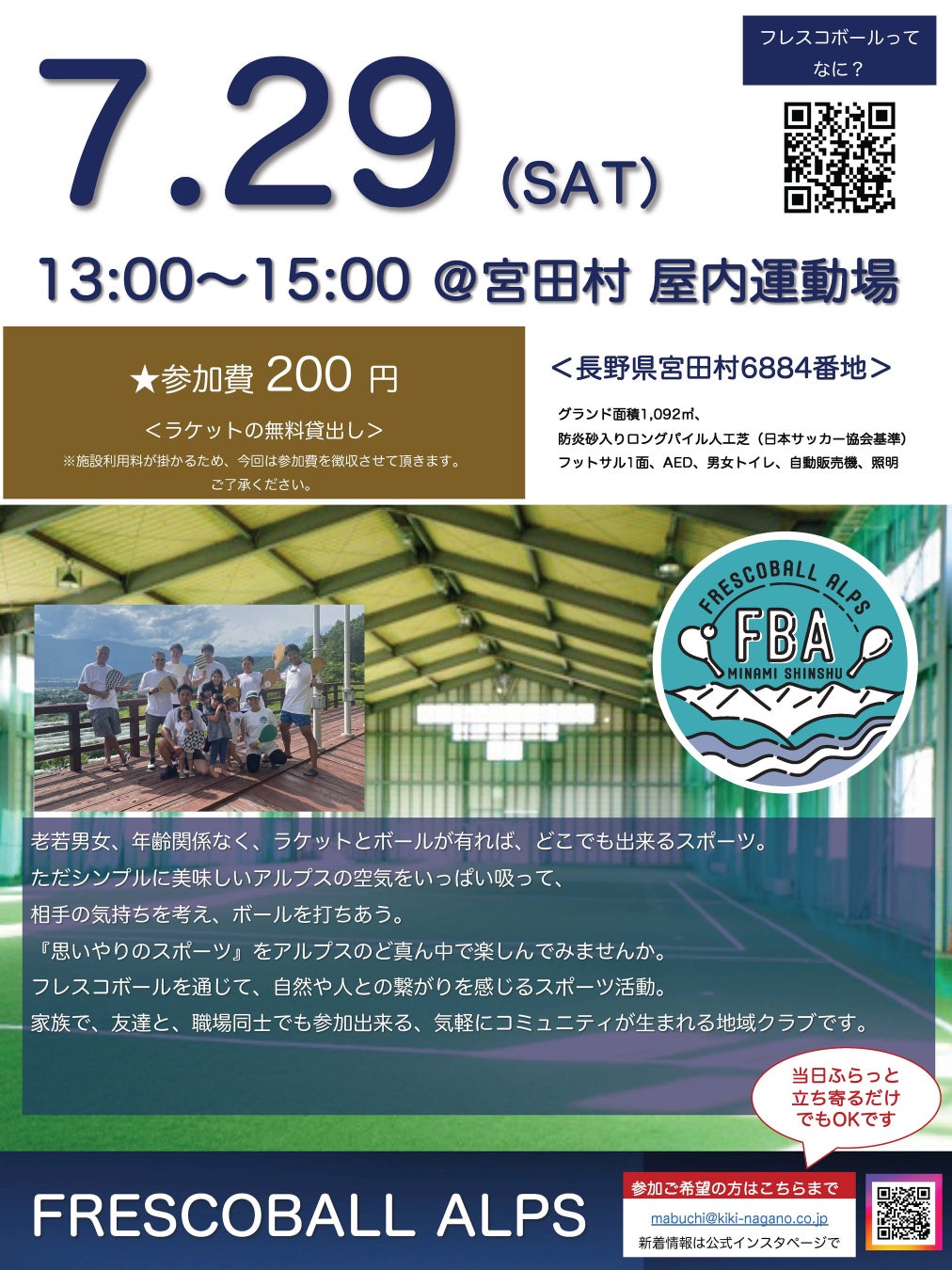 日本フレスコボール協会(JFBA)、長野県駒ヶ根市の公認地域クラブ「FRESCOBALL ALPS」が7月29日(土)に宮田村屋内運動場で公式体験会を開催。