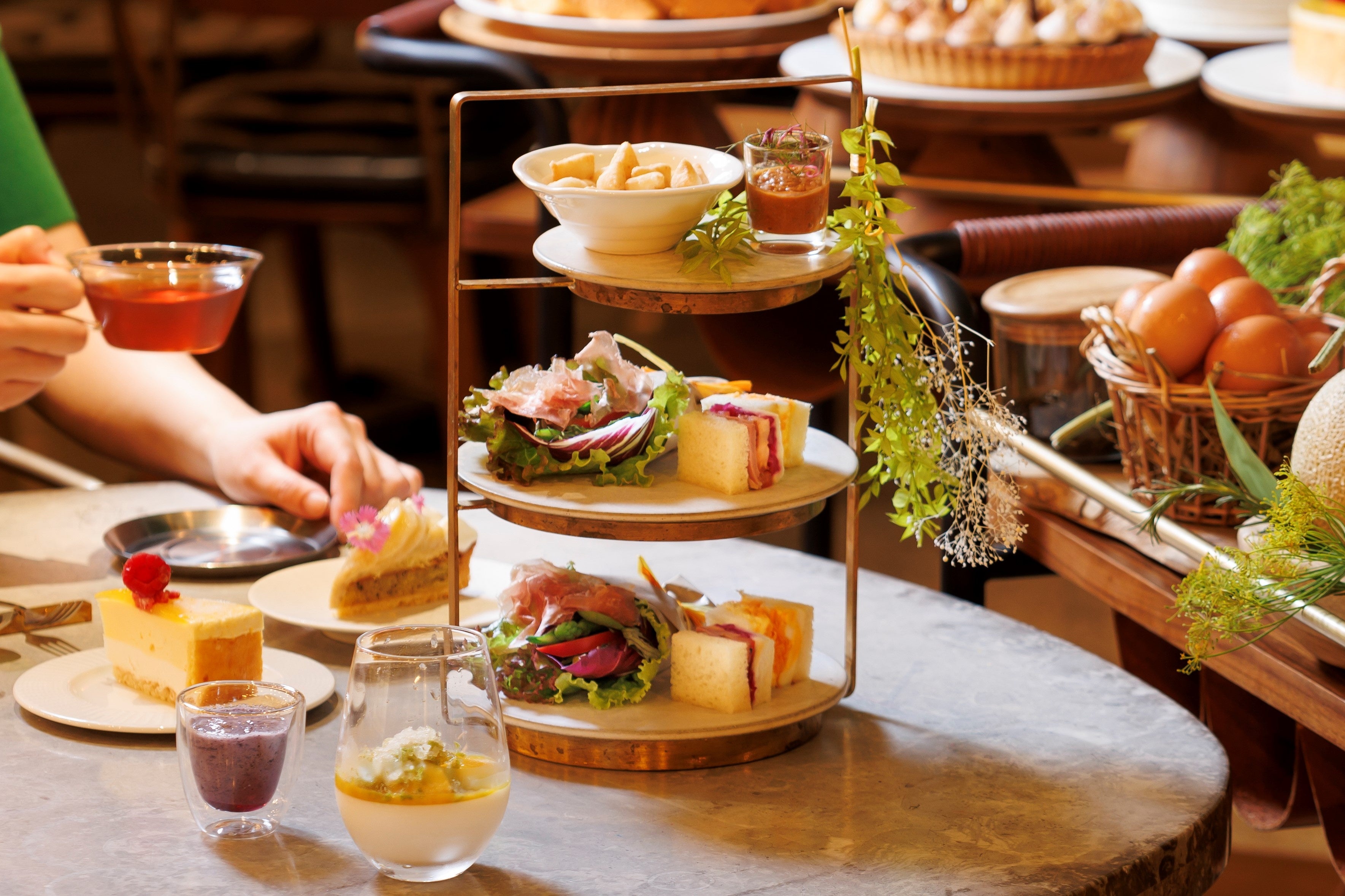 ウェルカムドリンクの「ブルーベリースムージー」から始まり、旬を迎えた桃と紅茶の風味の相性が抜群の「桃と紅茶のタルト」やジューシーなメロンとミルキーな生クリームが絶妙なバランスの「メロンショートケーキ」、爽やかなミントとライムの氷にパンナコッタとマンゴーソースを合わせた「トロピカルマンゴーモヒートかき氷」を始めとした全6種類のデザートに加え、京都発の人気ブーランジェリー『ル・プチメック』のパンドミを使用した「パストラミサンドイッチ」、切り立ての極薄生ハムで仕上げた「生ハムブーケ」など、見た目も華やかなセイボリー4種類がアフタヌーンティーを象徴するスタンドでご提供。