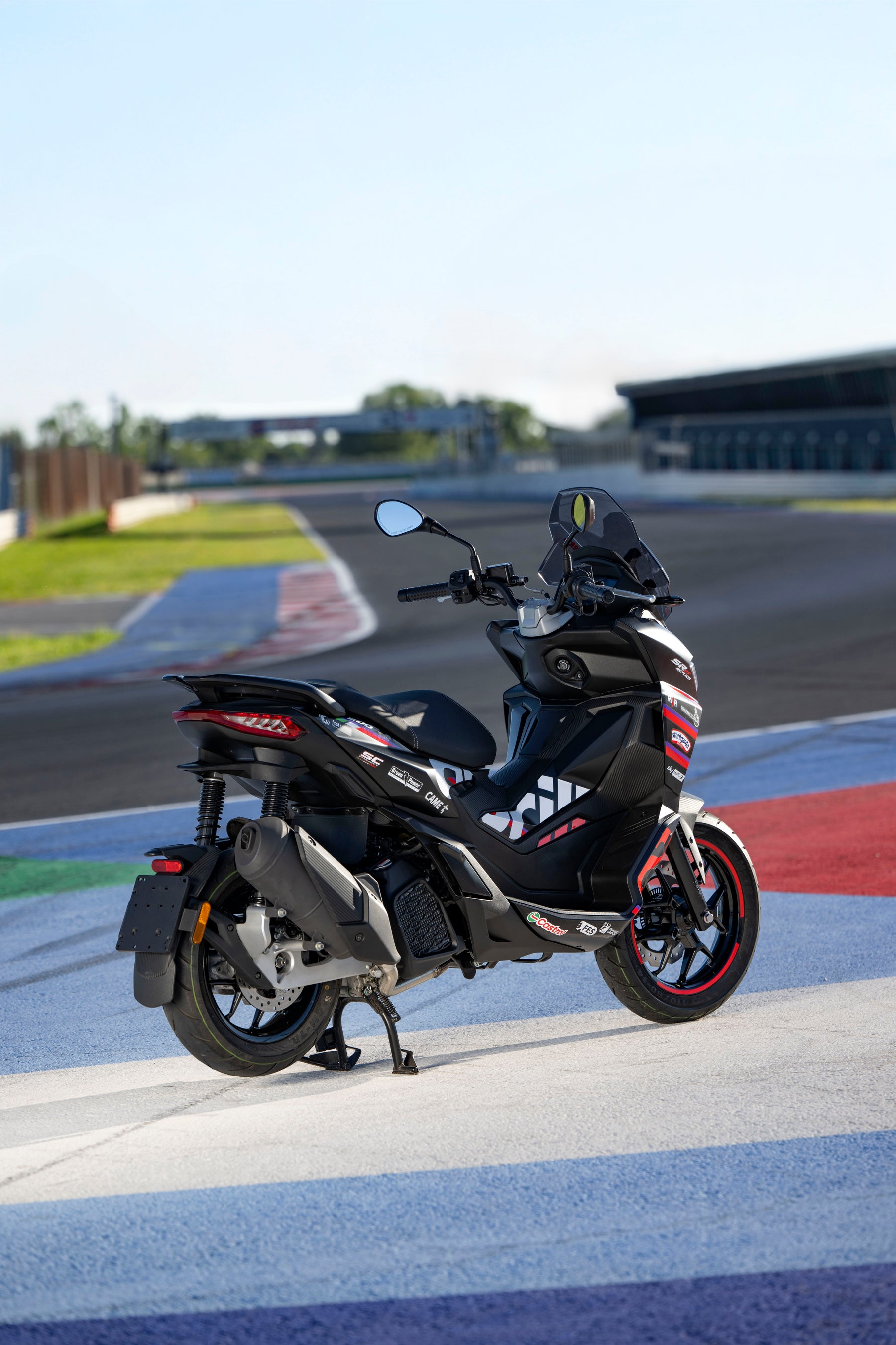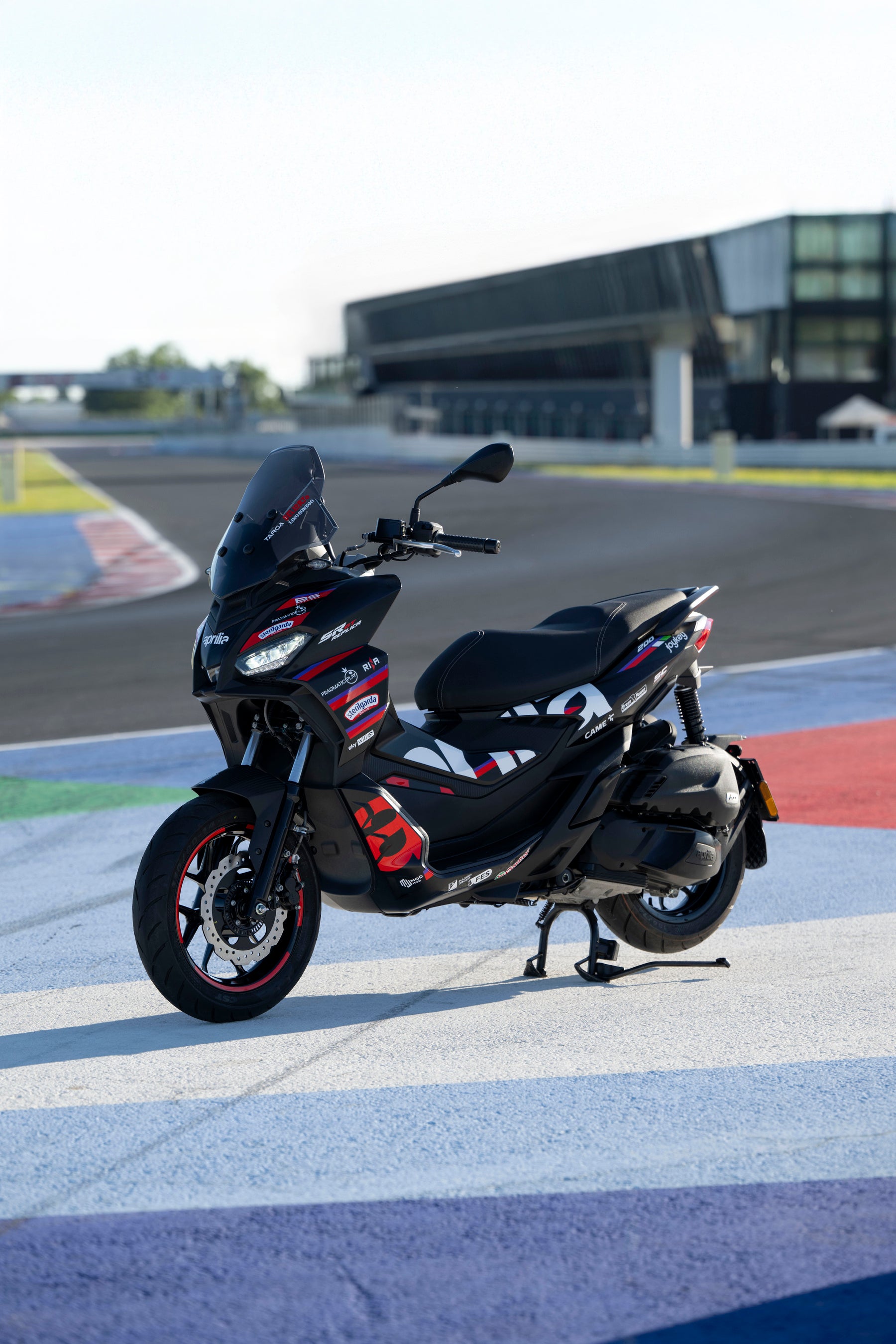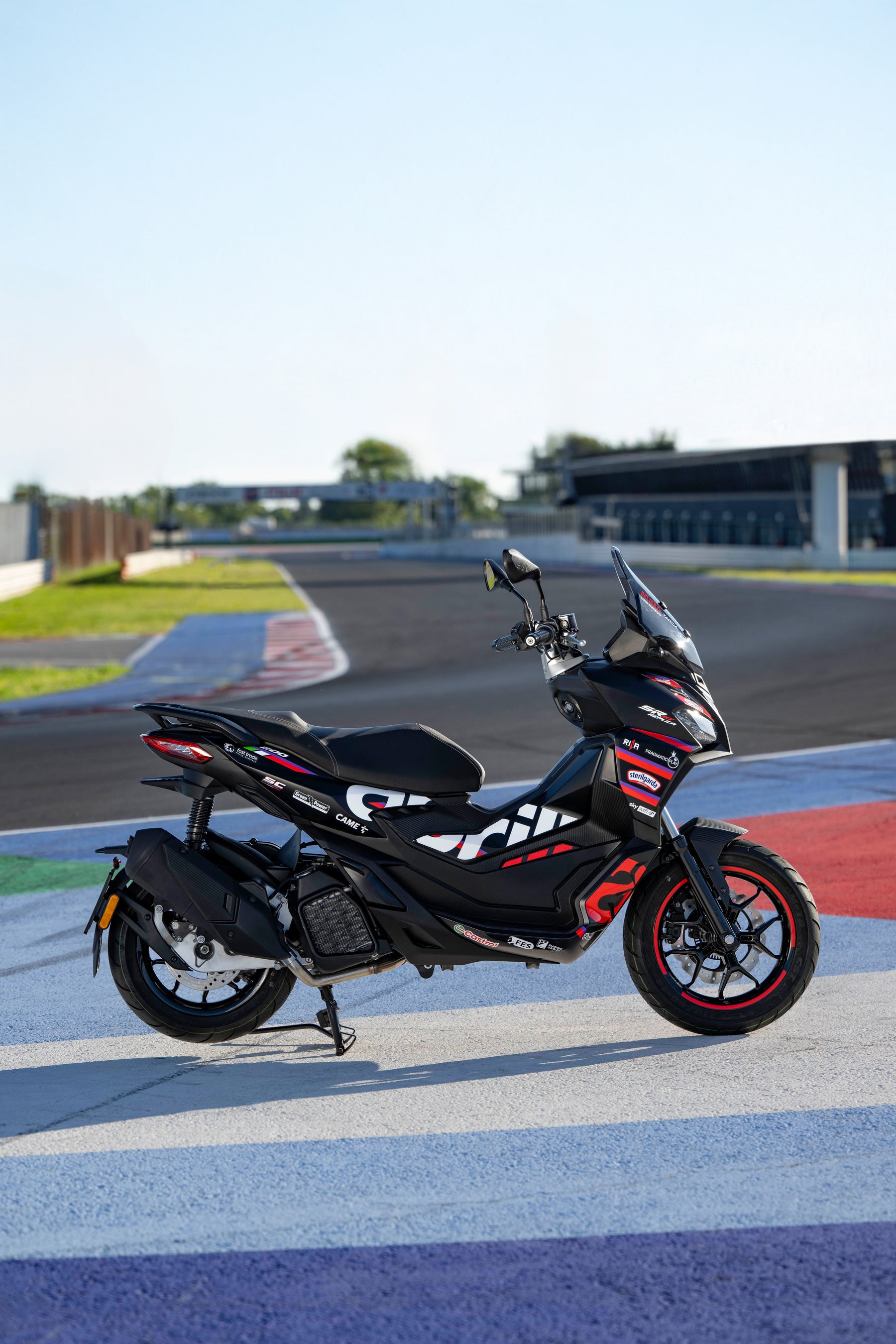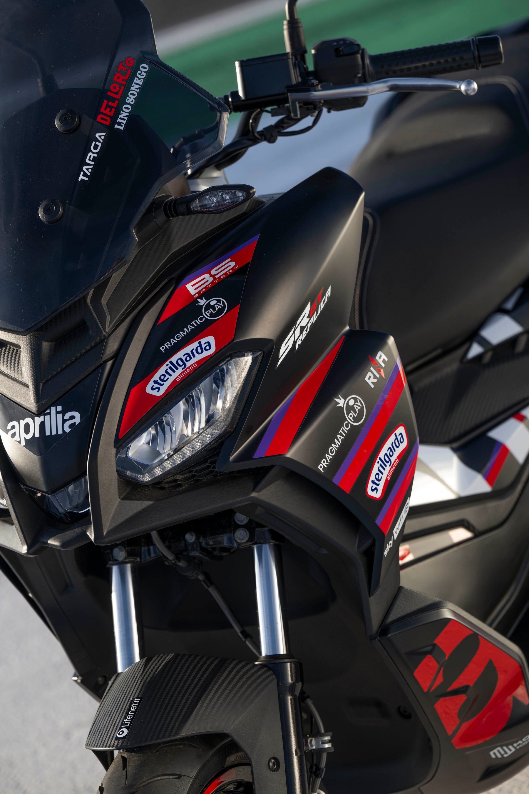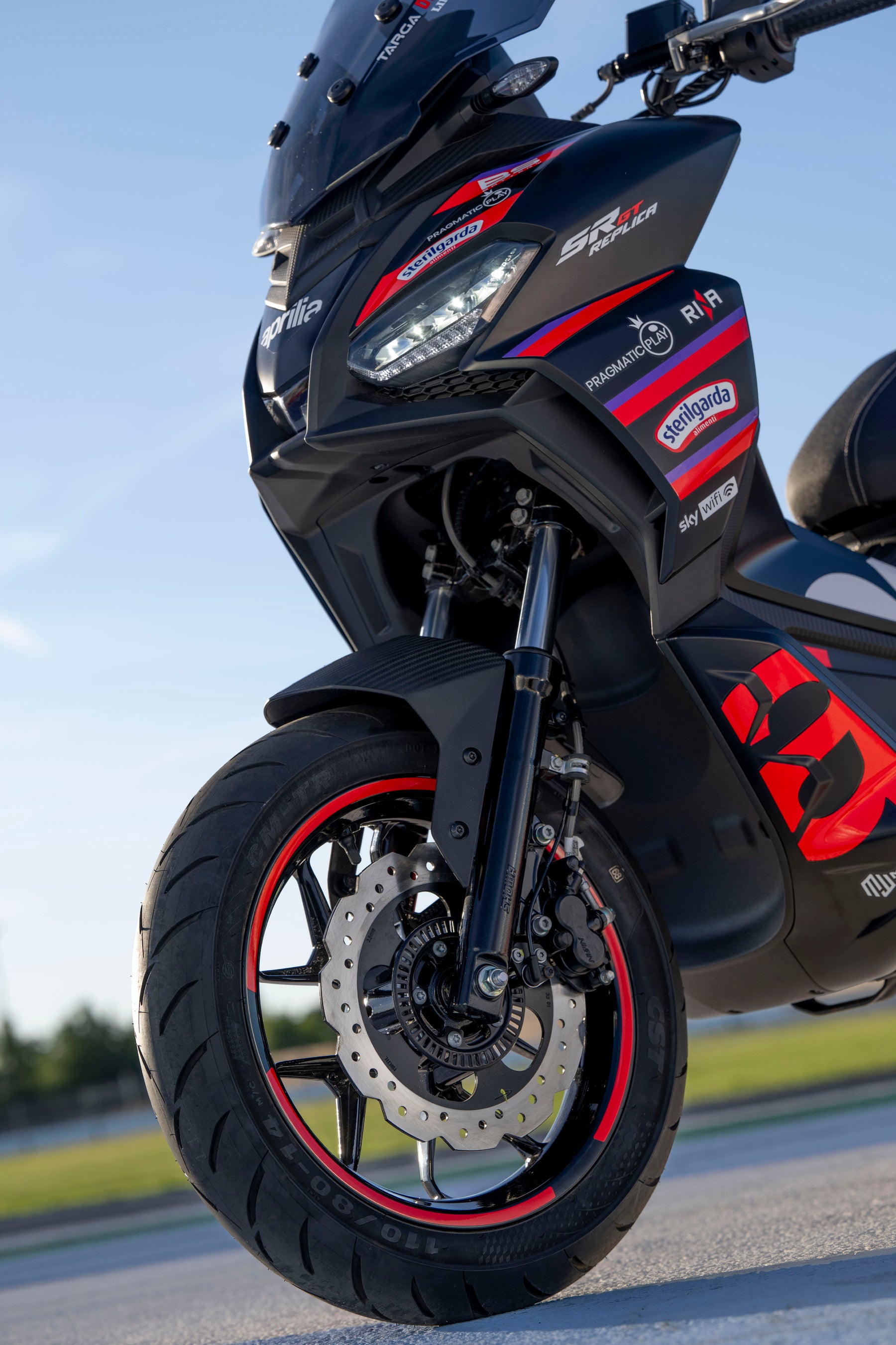 このSR GT 200 レプリカのデザインは、スポーティさとエクスクルーシブな外観にレーシングスピリットが反映され、RS-GR 25のグラフィックを忠実に再現しています。マットブラックのボディにレッドとパープルのグラフィックや、サイドにはapriliaロゴを大胆に配置。さらにブラックのフロントホイールにはレッドのストライプが施され、MotoGPで注目を集めるapriliaの最速マシンへの敬意を表しています。SR GT 200レプリカのアグレッシブな足回りには、スポーティなトレッドの専用ロードタイヤと、ウェーブプロファイルのフロントブレーキディスクを装着し、都市部でのあらゆる路面状況に対応しています。