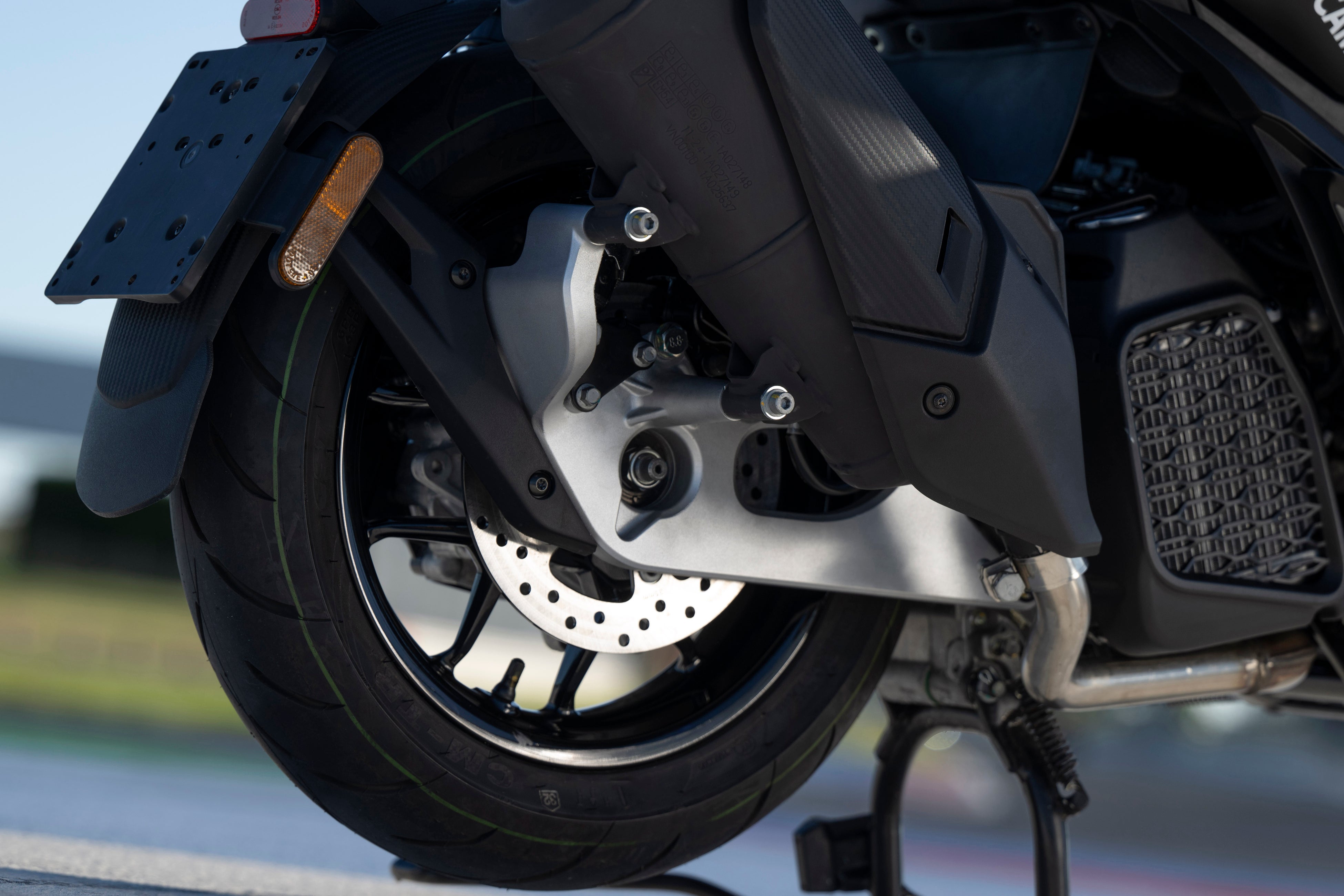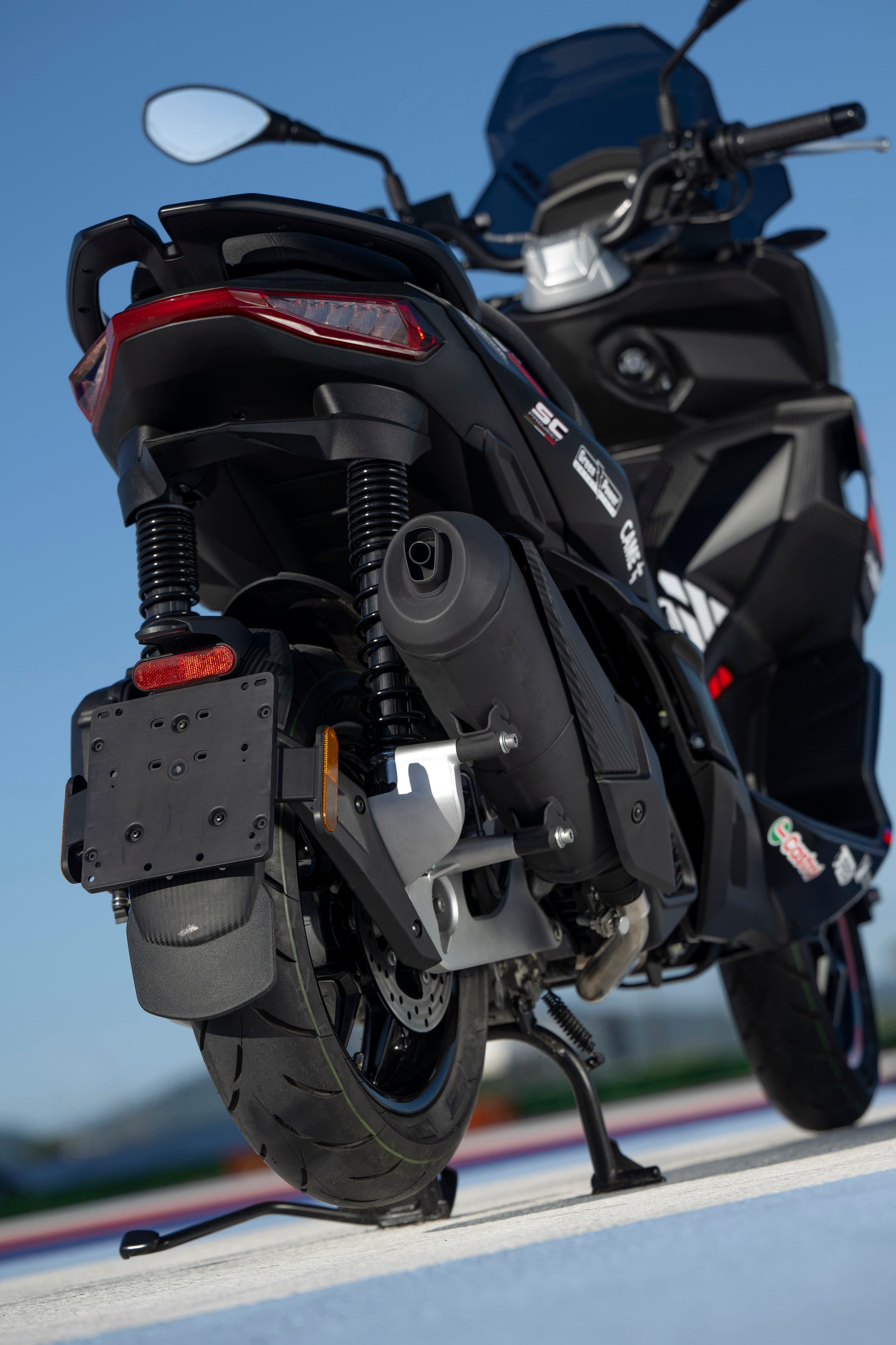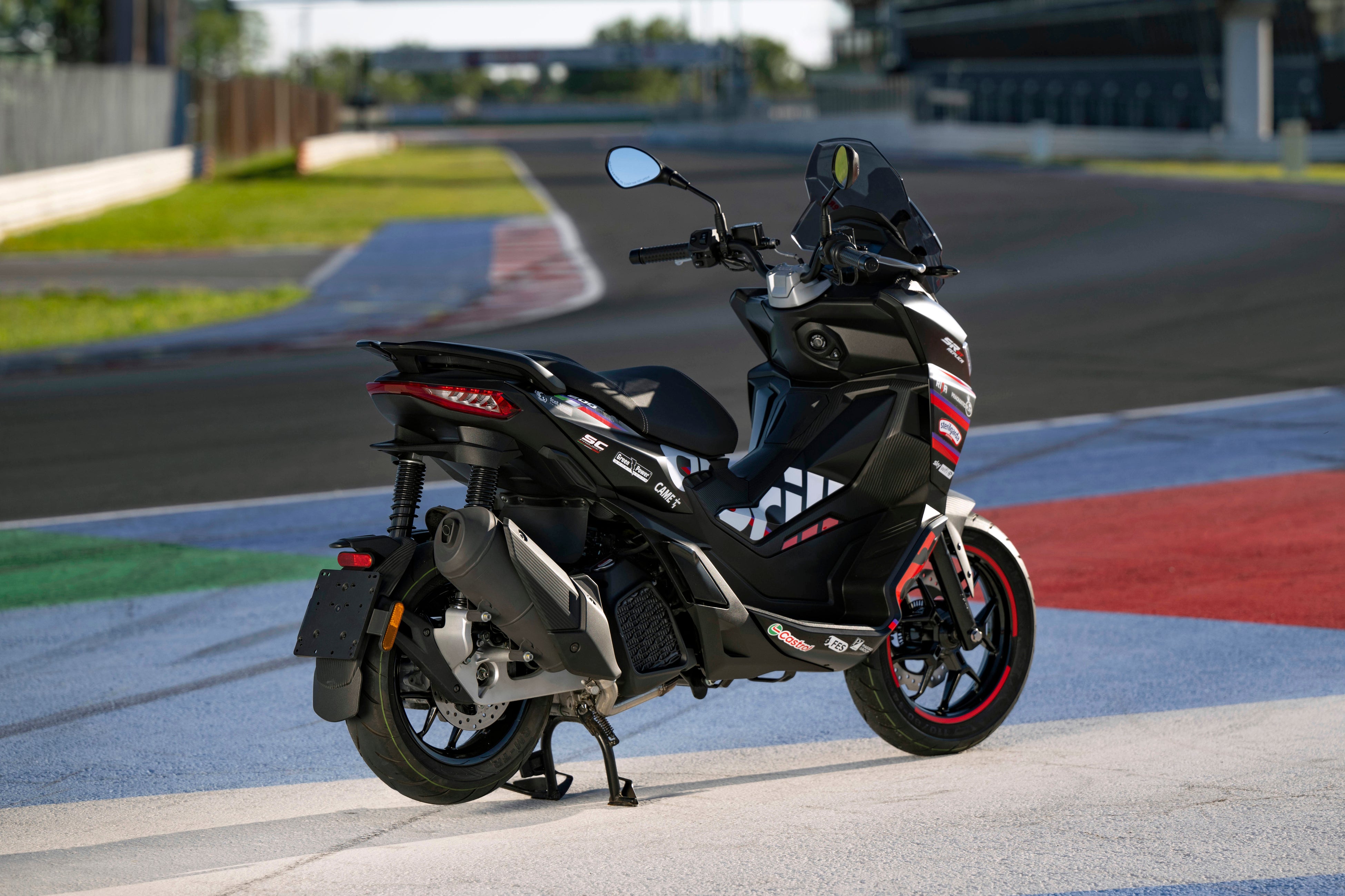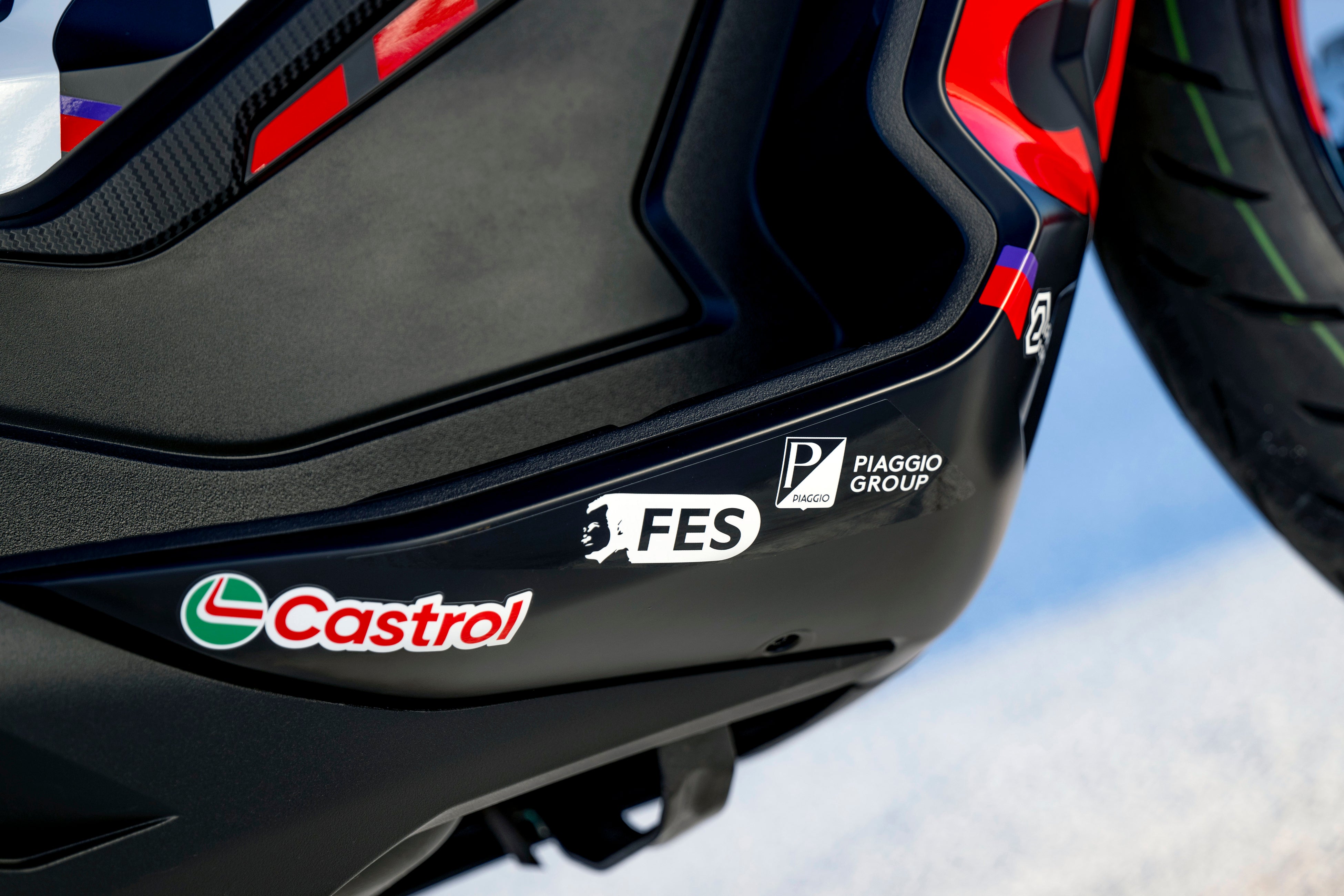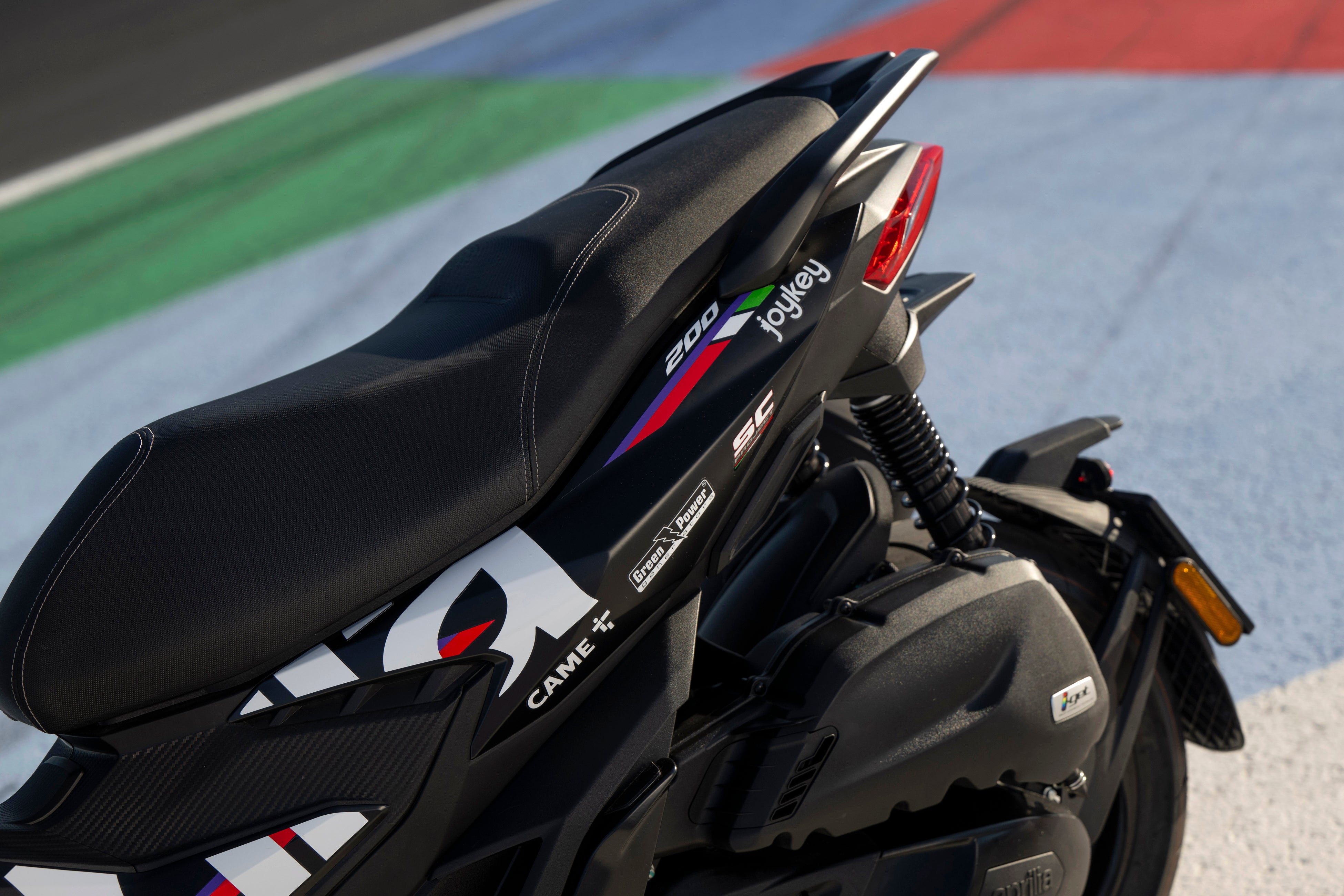 このSR GT 200 レプリカのデザインは、スポーティさとエクスクルーシブな外観にレーシングスピリットが反映され、RS-GR 25のグラフィックを忠実に再現しています。マットブラックのボディにレッドとパープルのグラフィックや、サイドにはapriliaロゴを大胆に配置。さらにブラックのフロントホイールにはレッドのストライプが施され、MotoGPで注目を集めるapriliaの最速マシンへの敬意を表しています。SR GT 200レプリカのアグレッシブな足回りには、スポーティなトレッドの専用ロードタイヤと、ウェーブプロファイルのフロントブレーキディスクを装着し、都市部でのあらゆる路面状況に対応しています。