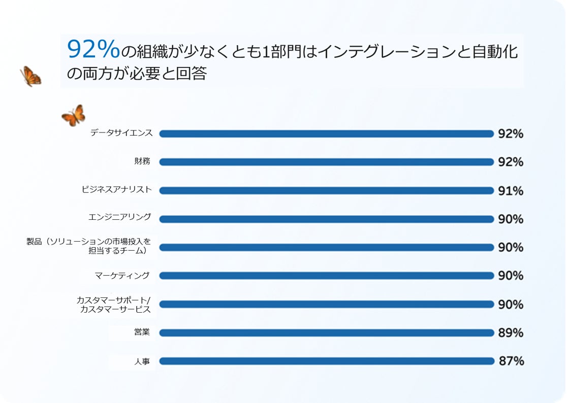 データ分析(64%)、製品(62%)、業務分析(61%)など、IT以外の多くの職種や部署が、その業務の効率的な遂行のために自動化を必要としています。