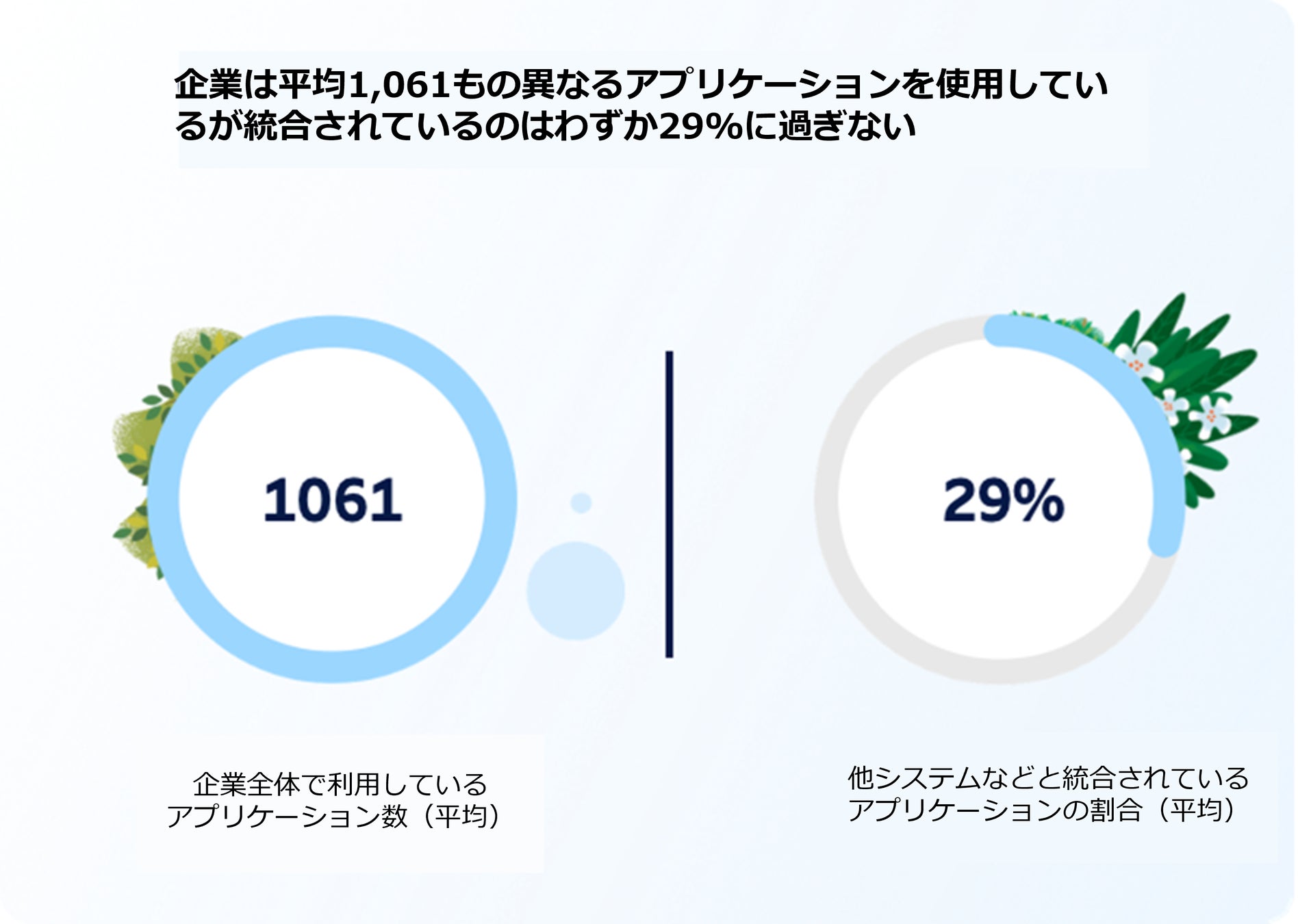 企業は、平均1,061ものアプリケーションを使用しており、その数は急速に増え続けていま す。これらアプリケーションのうち、他のシステムやプラットフォームと統合されているのは 29%に過ぎません。