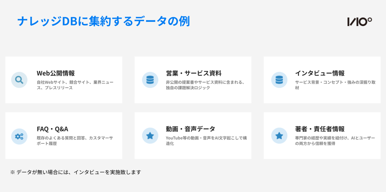 対象になるのは社内に散らばるほぼすべての情報です。例えば以下のような情報をもとにナレッジDBとして構造化します。