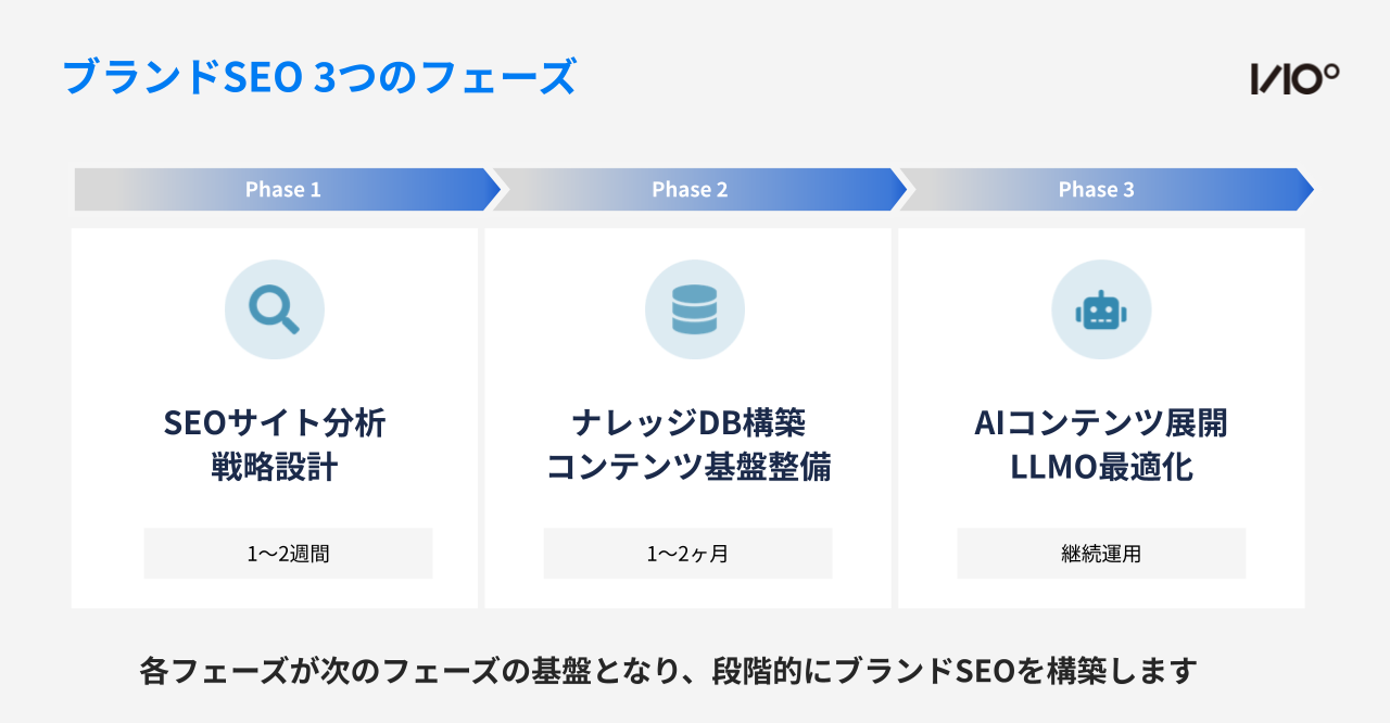 ブランドSEOは、以下の3つのフェーズで段階的に進めます。