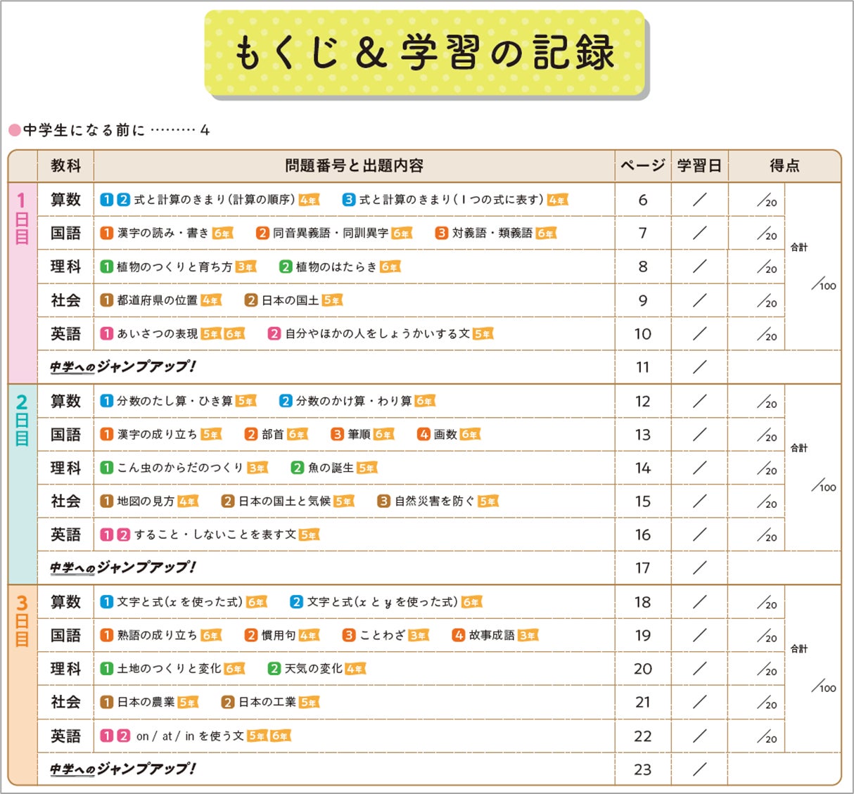 ▼1日分6ページの最後のページには特別コラム「中学へのジャンプアップ!」を設置