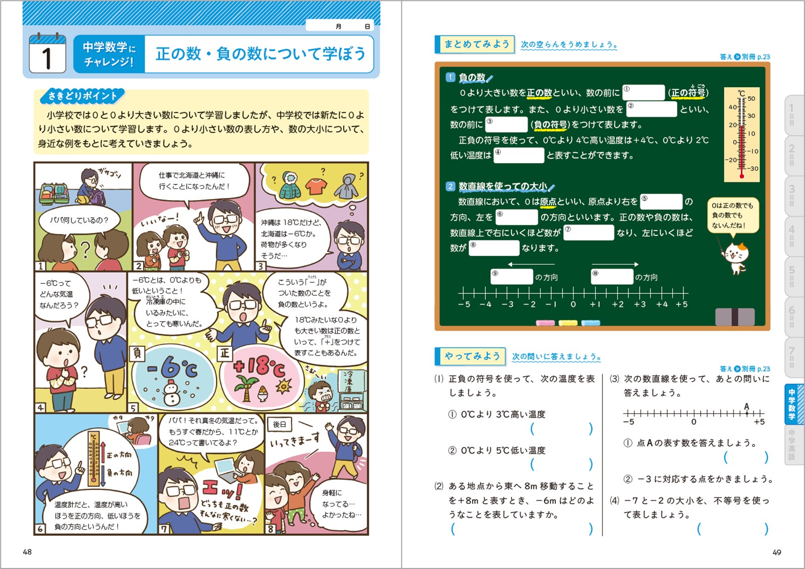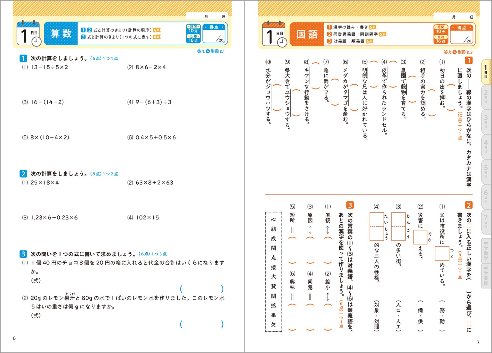 1ページ10 分でできる問題に取り組んで、小学校で学んだことがどれだけ身につ いているか確かめます。中学の学習につながる大切な問題を選んでいるので、効率よく復習することができます。