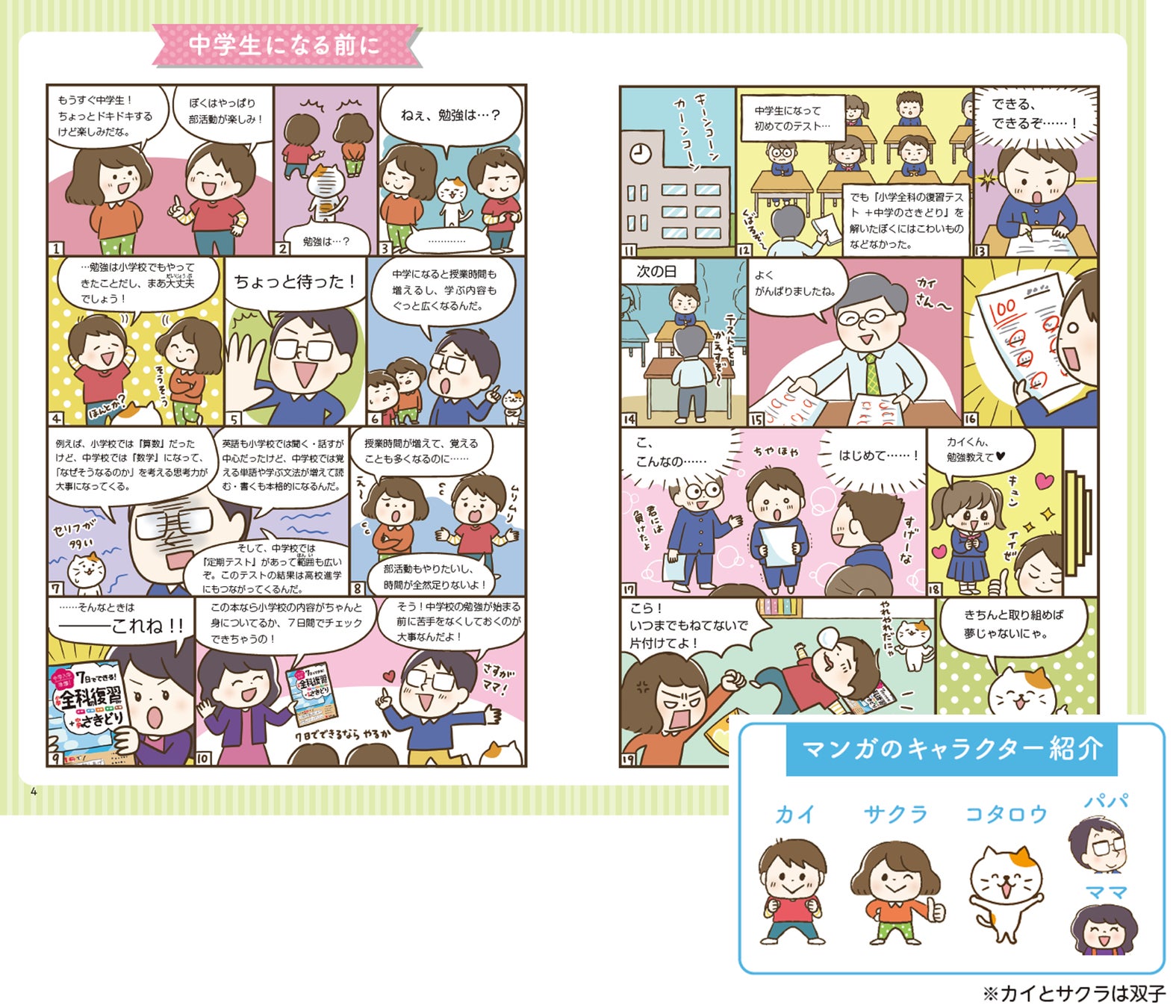 ・巻頭マンガでは、小学校と中学校の学習や生活のちがいなどについて解説
