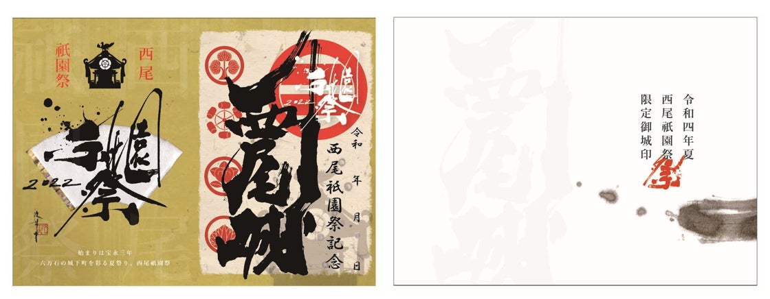内 容 西尾の夏祭り・西尾祇園祭2022バージョンの西尾城・御城印を1,400枚限定で販売します。夏の西尾の祭バージョンは、サイズが通常の倍(148㎜×200㎜)で、紙質(ベルーラスノーホワイト)にもこだわって制作しています。