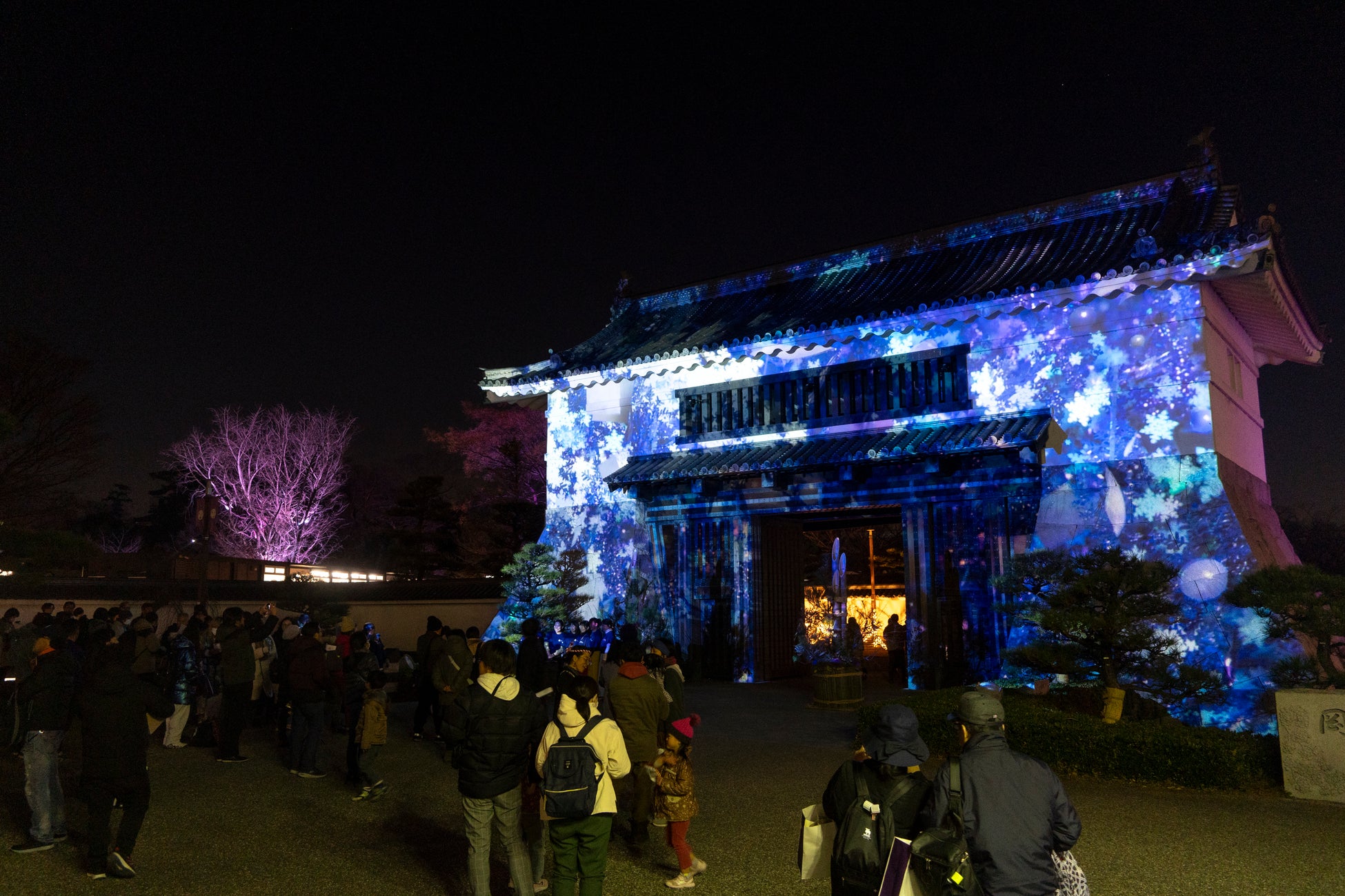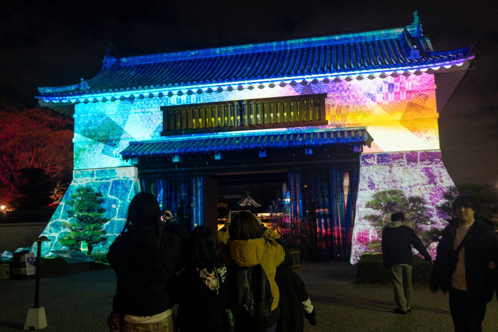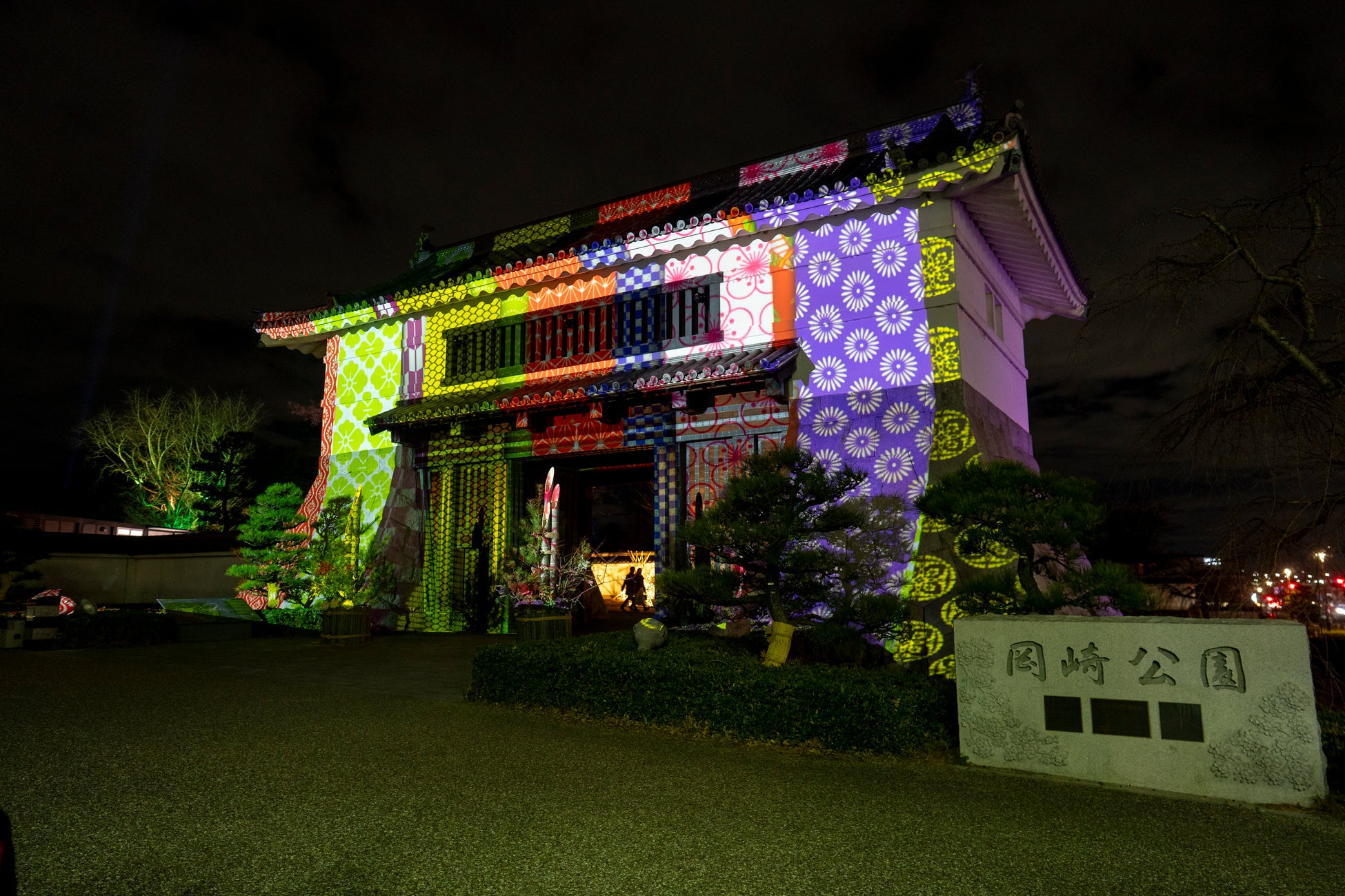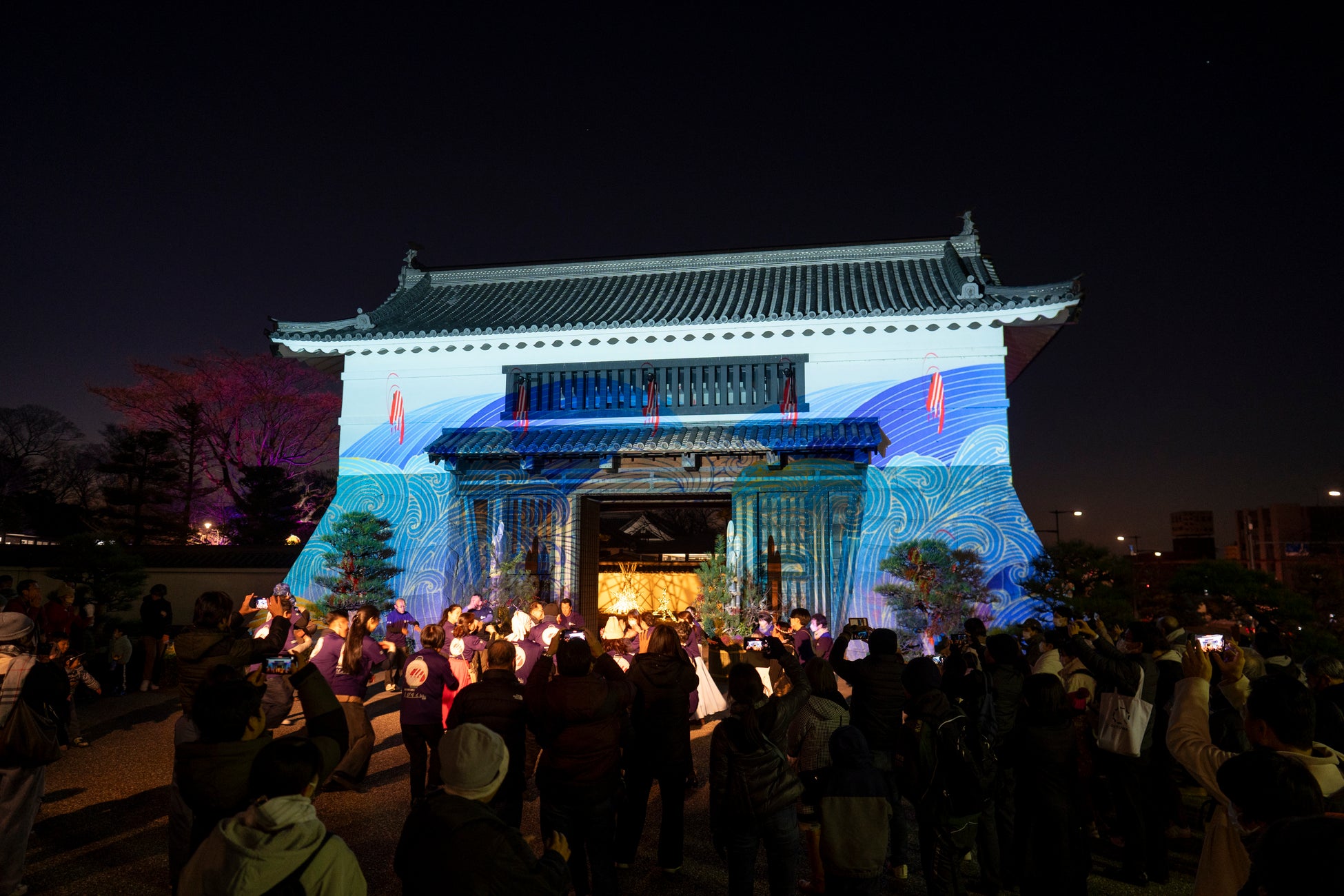 また、岡崎公園の表玄関で幅16.4メートル・高さ11メートルの岡崎公園大手門にもプロジェクションマッピング映像を投影しました。