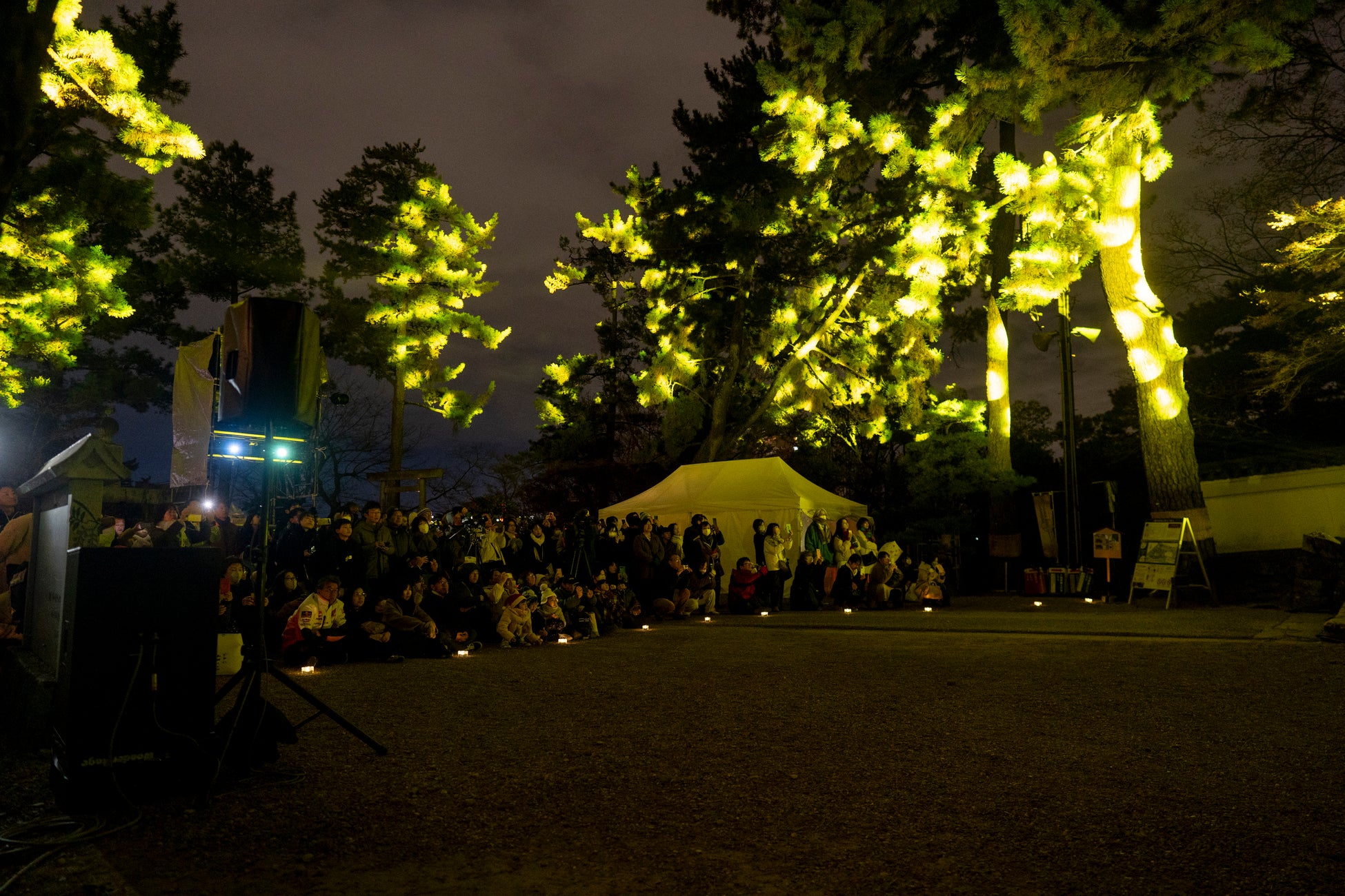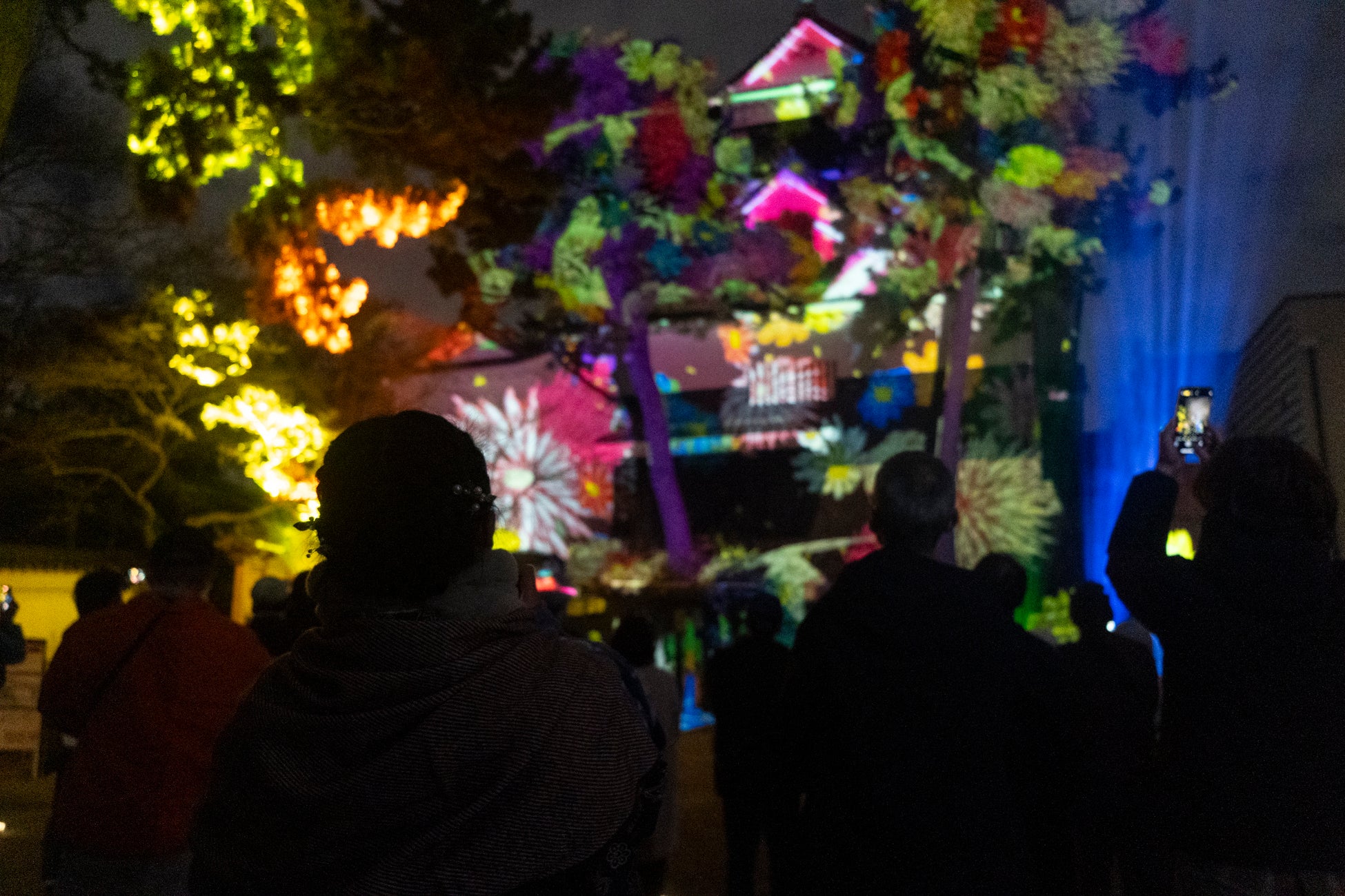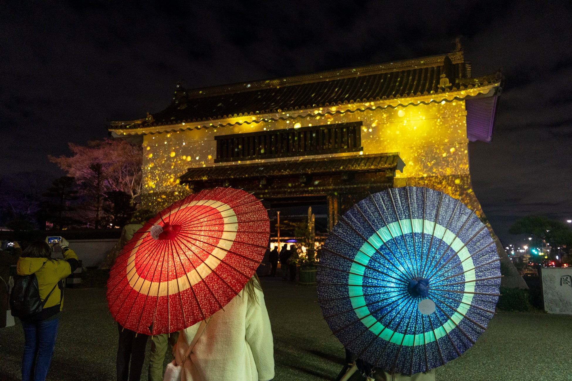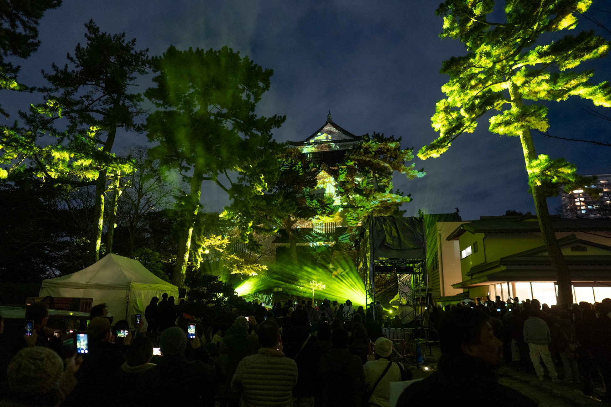 また、岡崎公園の表玄関で幅16.4メートル・高さ11メートルの岡崎公園大手門にもプロジェクションマッピング映像を投影しました。