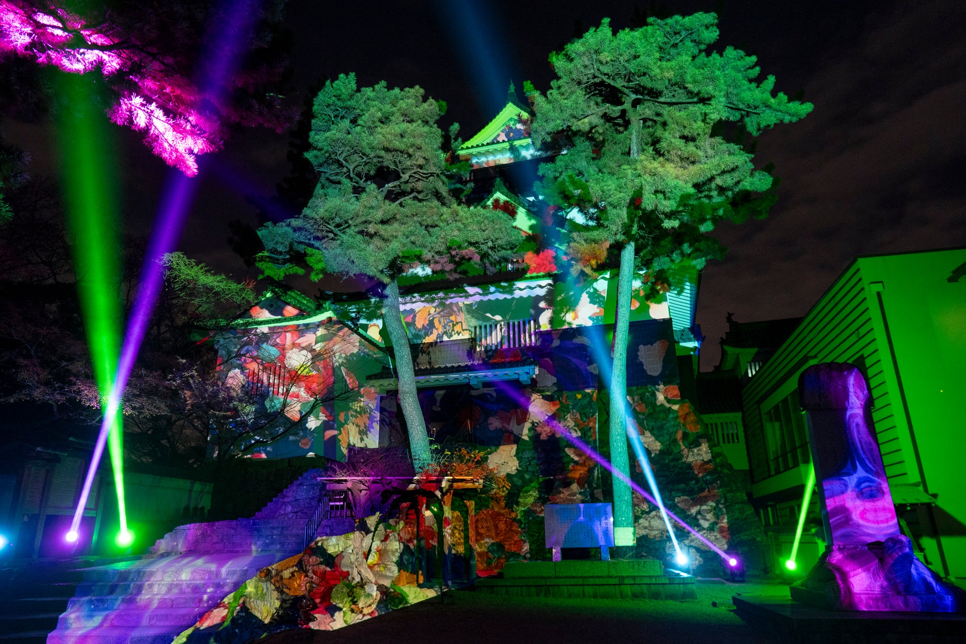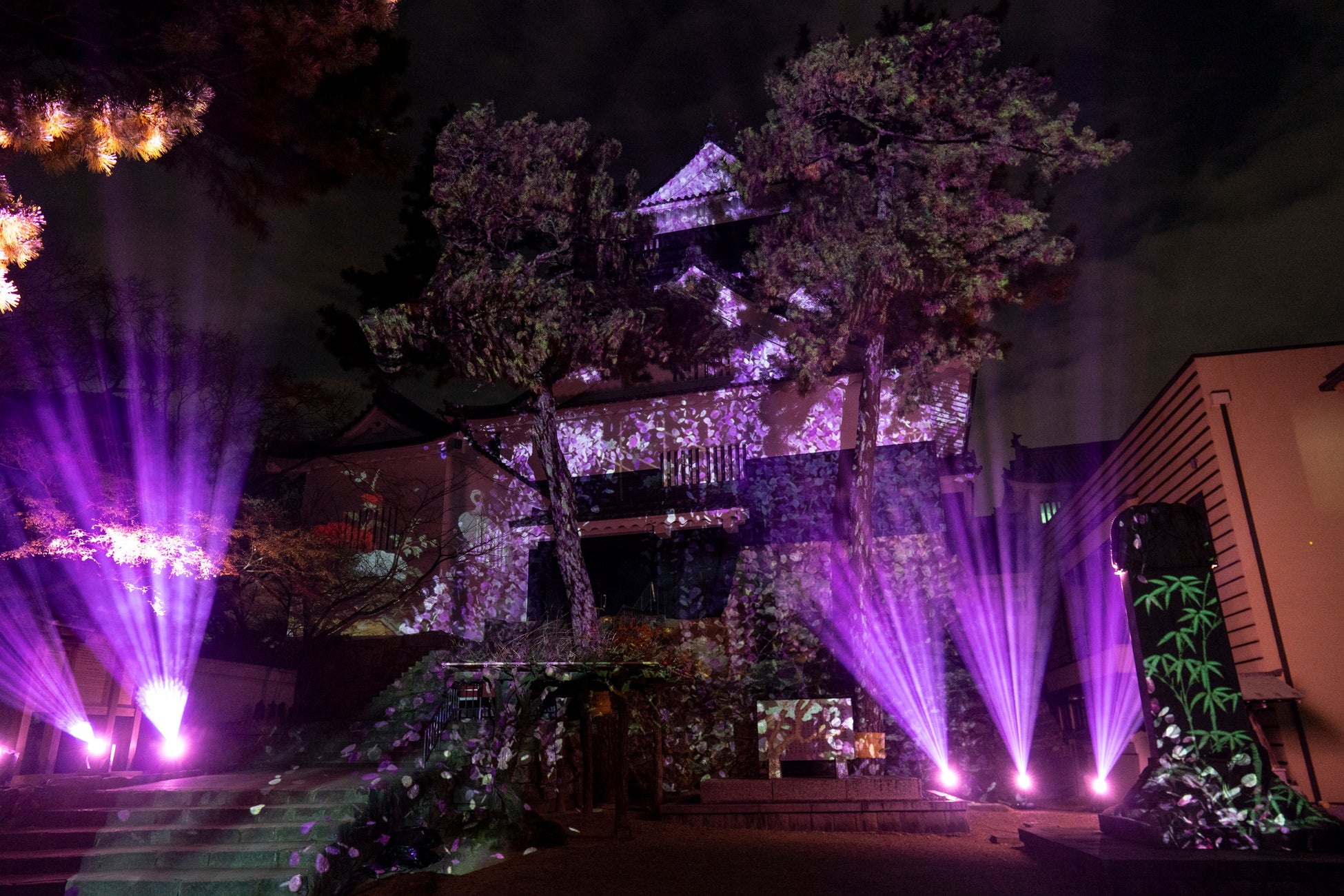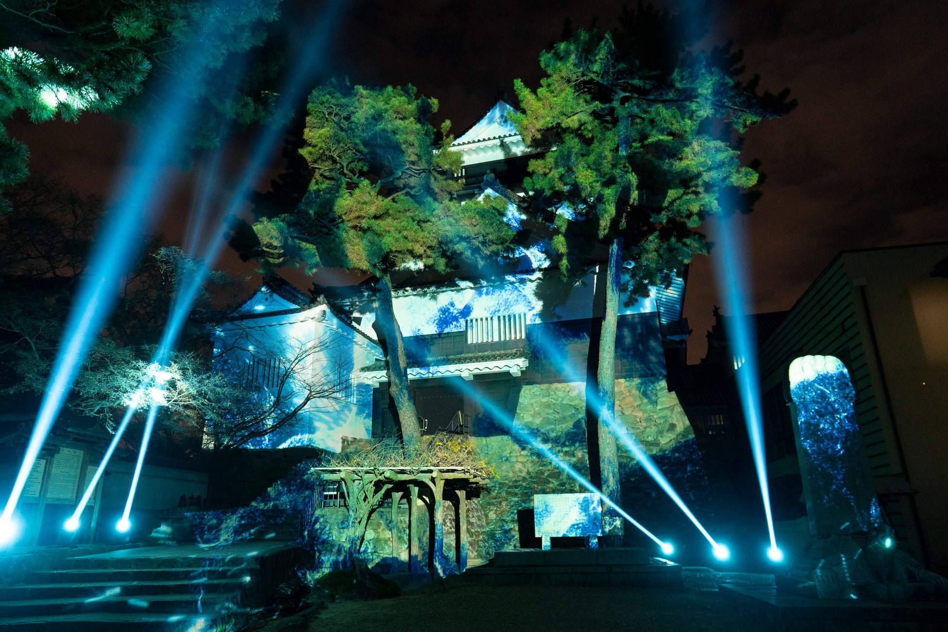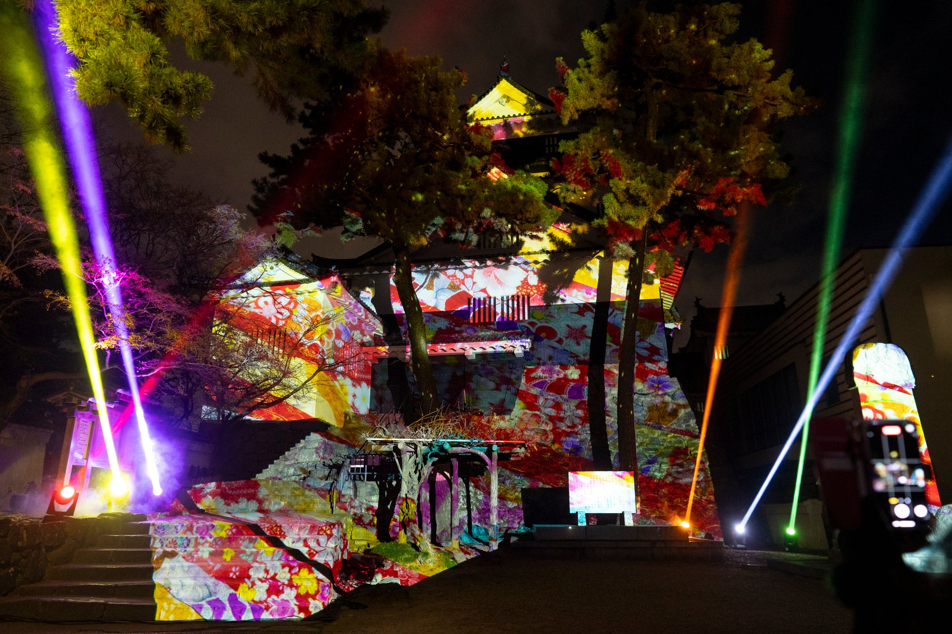 【内容】 徳川家康生誕の地で日本100名城・岡崎城天守閣に岡崎市の文化や歴史、伝統産業「三河花火」などをモチーフにしたデジタルアートコンテンツのプロジェクションマッピング映像を投影しました。