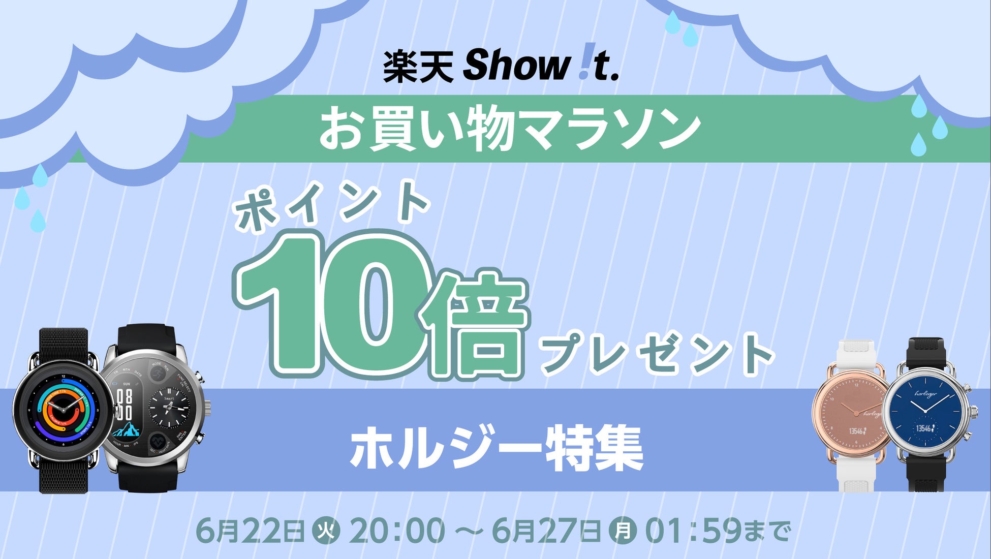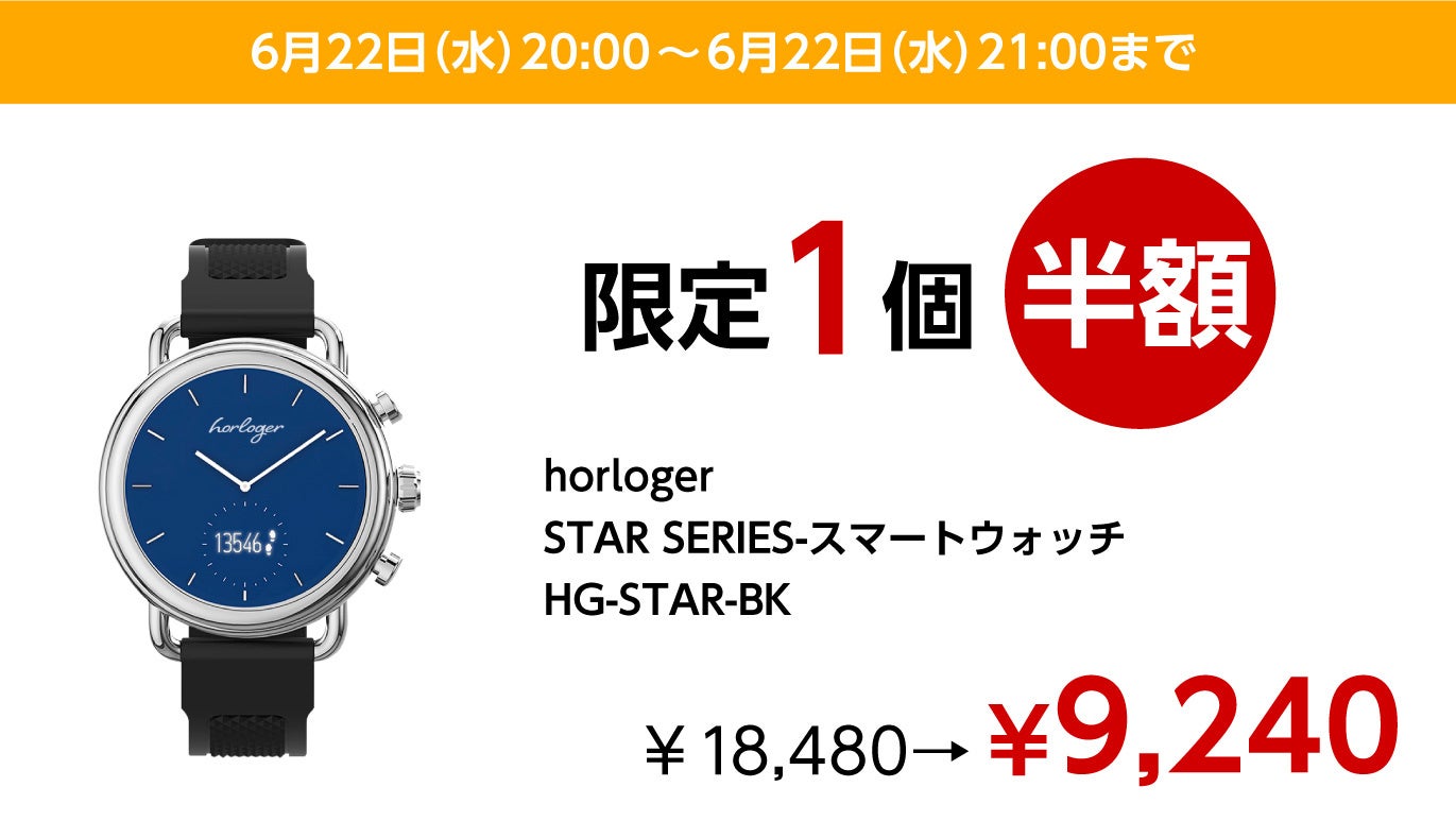 楽天市場「Show !t」は、6月22日(水)20時~21時限定STARシリーズのブラックを限定1個半額で販売致します。さらに、6月22日(水)20:00~6月27日(月)01:59まで開催される、ポイント10倍プレゼントの楽天お買い物マラソンに参加します。スマートウォッチHorlogerシリーズは、ビジネスシーンにも馴染むアナログの様な見た目のハイブリット型文字盤が魅力的なデザインです。実用的な着信・メッセージ通知機能と健康管理機能も搭載。スマートウォッチデビューにもおすすめです。