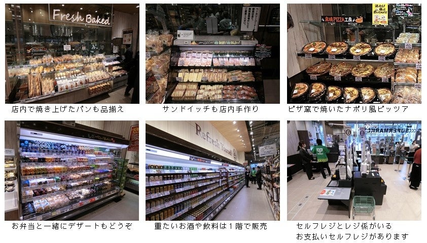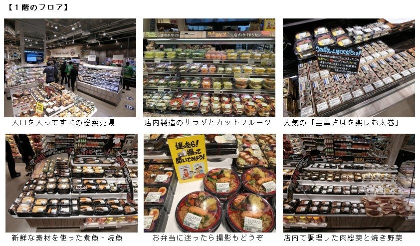 1階にはすぐにおいしく食べられるお総菜・ベーカリーのでき立て・作り立て商品を単身者の方もファミリー世帯の方にも、買いやすい量で品揃えしています。また、調理の手間を省いたおいしい即食・簡便商品の品揃えも充実させました。