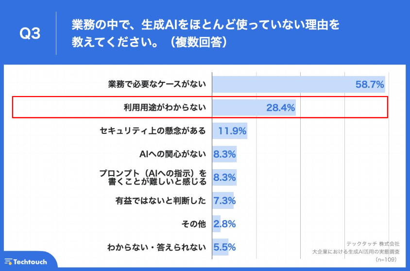Q1で「ほとんど使用していない」と回答した方に、「Q3.業務の中で、生成AIをほとんど使っていない理由を教えてください。(複数回答)」(n=109)と質問したところ、「業務で必要なケースがない」(58.7%)、「利用用途がわからない」(28.4%)、「セキュリティ上の懸念がある」(11.9%)という回答となりました。