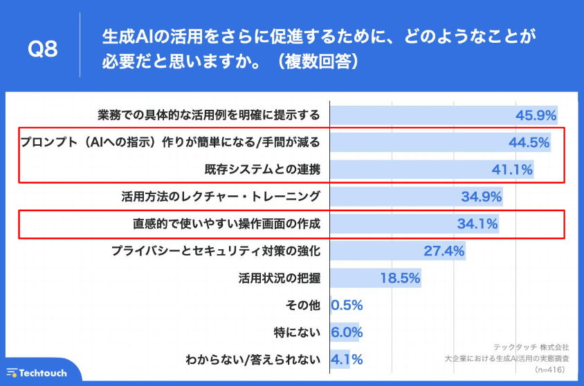 「Q8.生成AIの活用をさらに促進するために、どのようなことが必要だと思いますか。(複数回答)」(n=416)と質問したところ、「業務での具体的な活用例を明確に提示する」(45.9%)、「プロンプト(AIへの指示)作りが簡単になる/手間が減る」(44.5%)、「既存システムとの連携」(41.1%)という回答となりました。