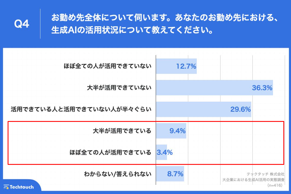 「Q4.お勤め先全体について伺います。あなたのお勤め先における、生成AIの活用状況について教えてください。」(n=416)と質問したところ、「大半が活用できている」(9.4%)と「ほぼ全ての人が活用できている」(3.4%)を併せて1割程度と、活用できている層はわずかでした。