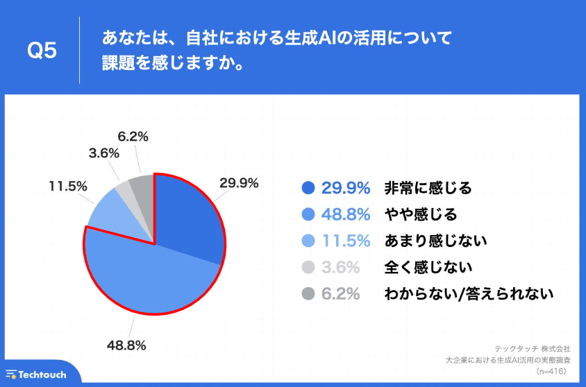 「Q5.あなたは、自社における生成AIの活用について課題を感じますか。」(n=416)と質問したところ、「非常に感じる」(29.9%)、「やや感じる」(48.8%)という回答となり、約8割が活用において何らかの課題を感じています。