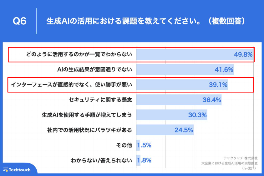 Q5で「非常に感じる」「やや感じる」と回答した方に、「Q6.生成AIの活用における課題を教えてください。(複数回答)」(n=327)と質問したところ、「どのように活用するのかが一覧でわからない」(49.8%)、「AIの生成結果が意図通りでない」(41.6%)、「インターフェースが直感的でなく、使い勝手が悪い」(39.1%)という回答となりました。