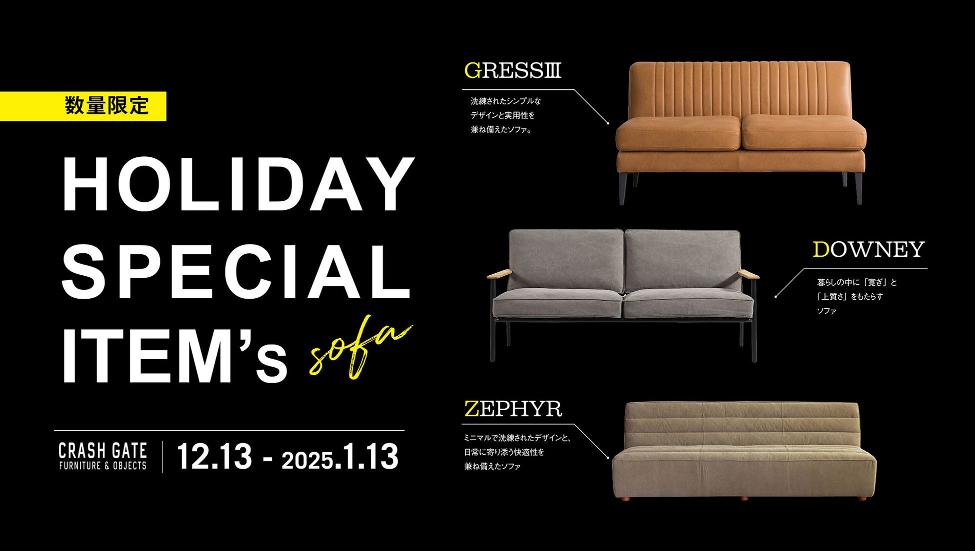 どんなお部屋にも馴染む心地よいデザインと、年末年始のくつろぎをより特別な時間にしてくれる実用性と快適さを追求したラインナップです。クラッシュゲートからの1年の感謝を込めた3タイプのソファは、お買い求めいただきやすい価格のため期間も数量も限られたホリデーシーズン特別企画となっております。価格は税込50,000円~140,000円です。ぜひこの機会をお見逃しなく!