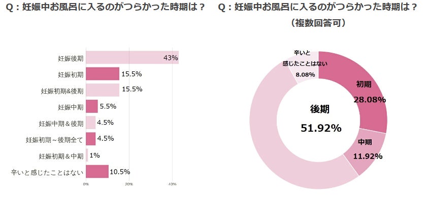 続いて多かったのが“妊娠初期”の15.5%となっています。こちらも、“初期”のみという回答以外の初期&後期/初期~後期全て/初期&中期の数値を合わせてみると36.5%と、3割以上の人が初期のお風呂がつらかったと回答しています。