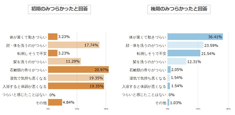 初期のみつらいという方の回答は石鹸の香り・体調が悪くなる、などといった体調面の問題がトップ3で後期は重さやバランスなどといった理由がトップになりました。