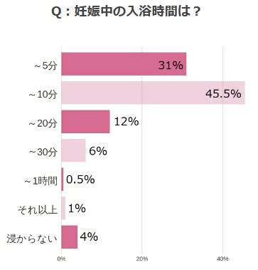 実際の入浴時間はどのくらいだったのかというと、~10分以下で済ませている人が76%と圧倒的で、20分を超えての長風呂をする人は非常に少ないということがわかりました。 前項で記載したとおり、妊娠中は様々な影響が体に出ているため、妊婦さんはゆっくりのんびりお風呂に浸かる、ということがなかなかしずらいというのが実情です。