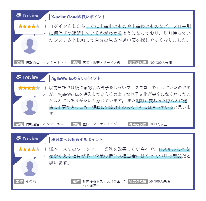 申請状況の可視化、確認が容易な点や、組織改編にスムーズに対応できる点などをご評価いただき、高い満足度につながりました。今回の集計期間内において投稿いただいたレビューの一部をご紹介いたします。