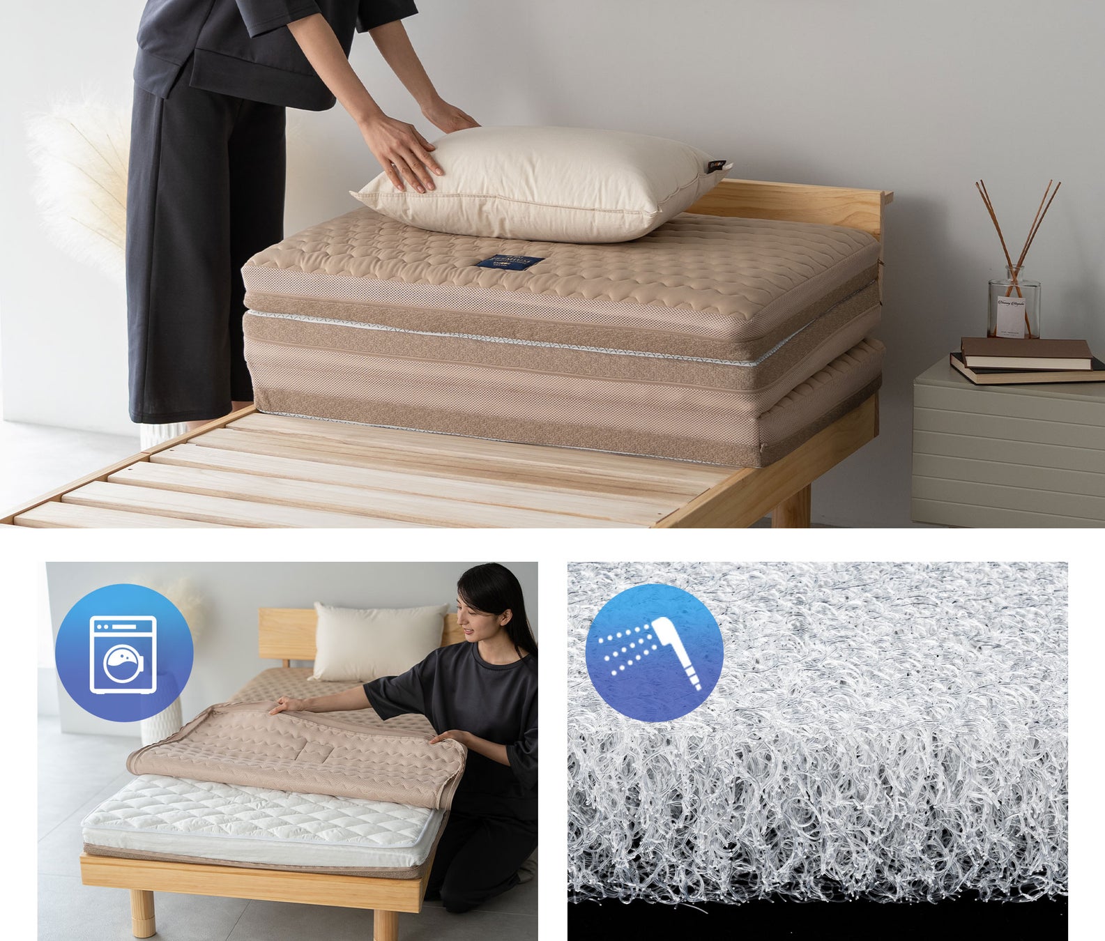 カバー・ベッドパッドは洗濯機で、中材はシャワー洗い可能。汗や汚れ、ホコリをため込みにくく、いつでも清潔な寝環境を保てます。カビが発生しやすい寝室環境の方や、子育て世帯やアレルギー対策を重視する方にもおすすめです。