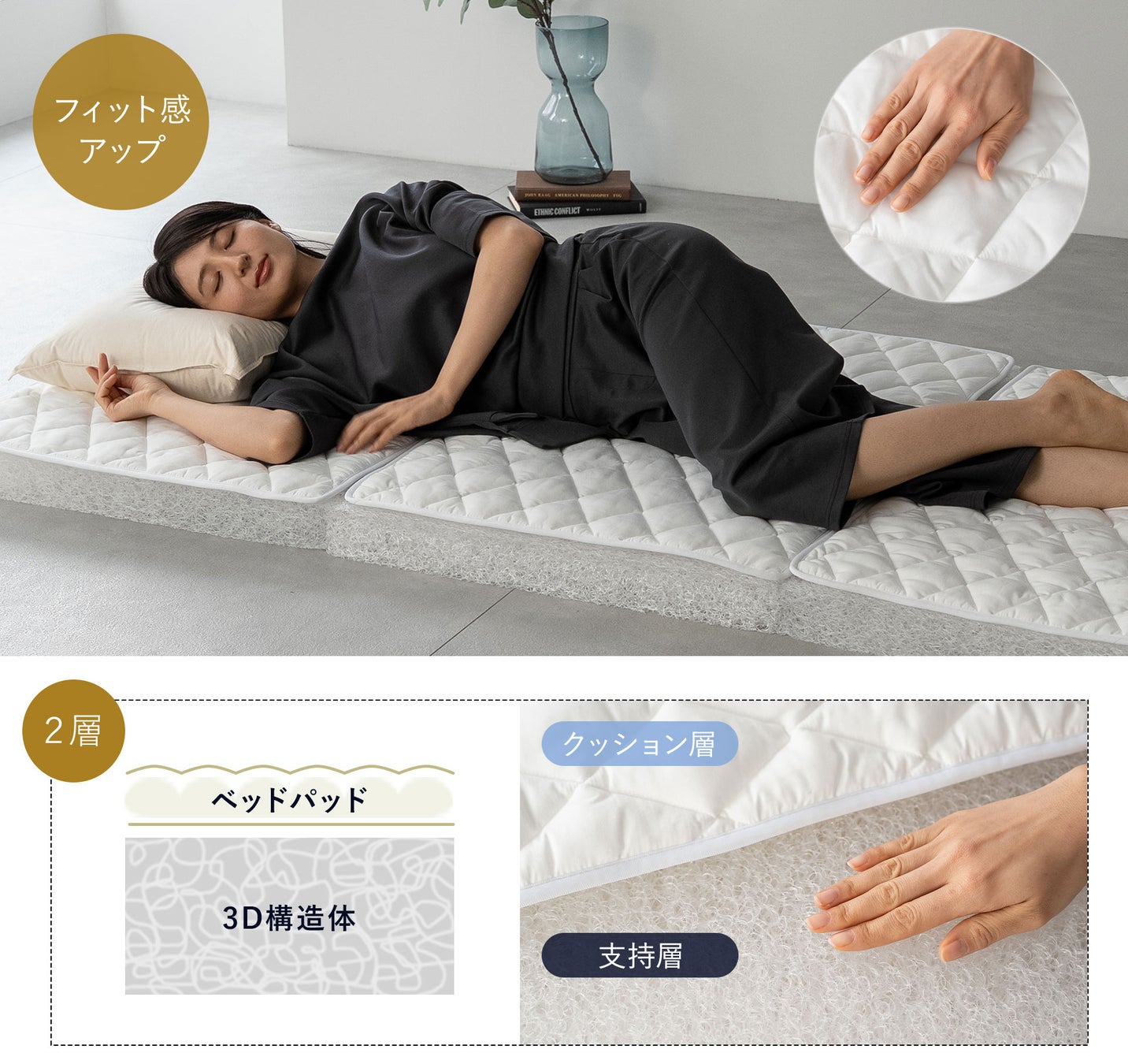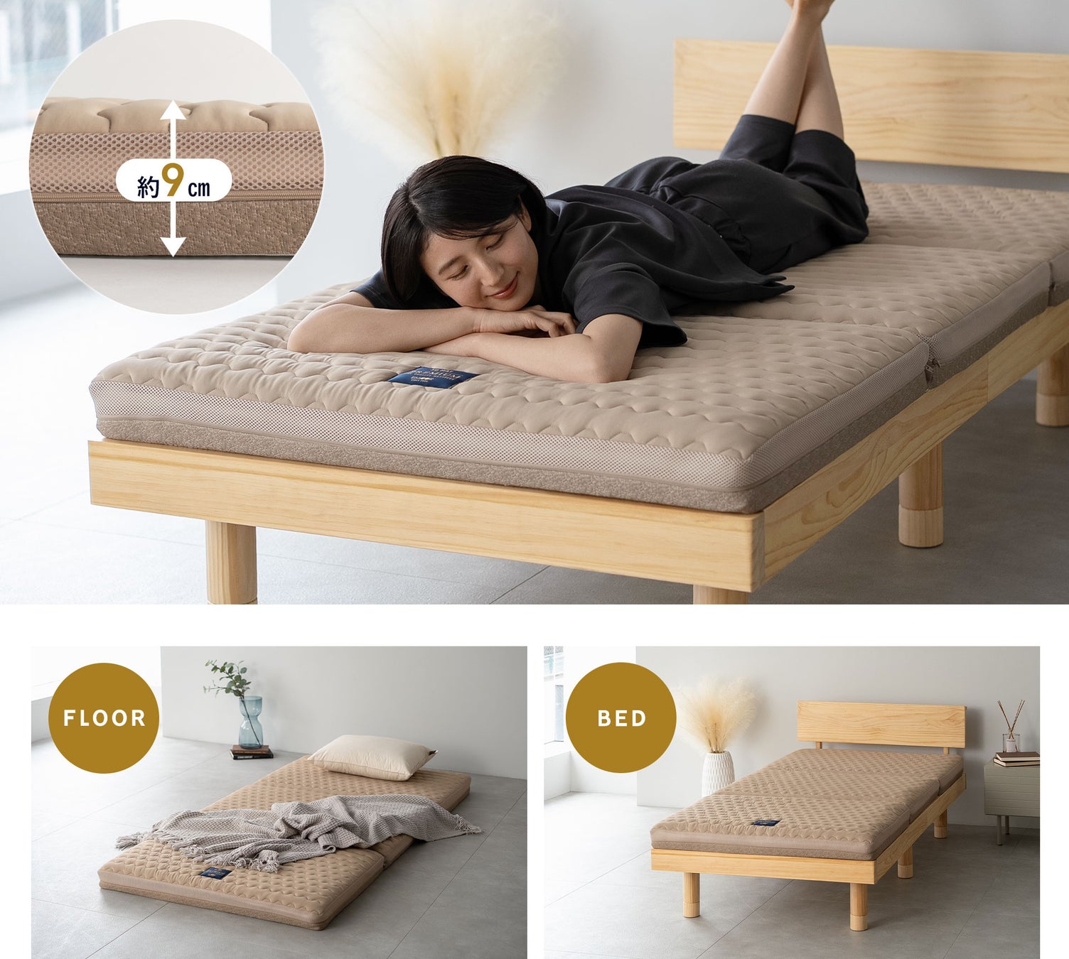 従来モデルより厚みを持たせた9cm構造で、底付き感を軽減。適度な反発力とクッション性をバランスよく備え、上位モデルにふさわしいプレミアムな寝心地を実現しました。また、三つ折りタイプのため、収納や移動がラクラク。和式布団としても、ベッドフレームでも使える万能設計です。毎日お布団を上げ下ろしする方にもおすすめです。