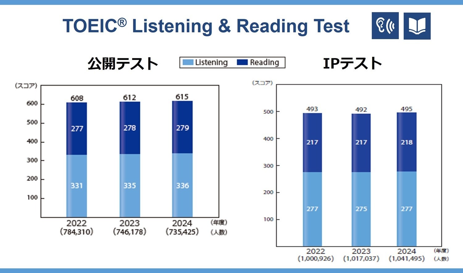 2024年度のTOEIC L&Rの平均スコアは、公開テストでは615点、IPテストでは495点でした。
