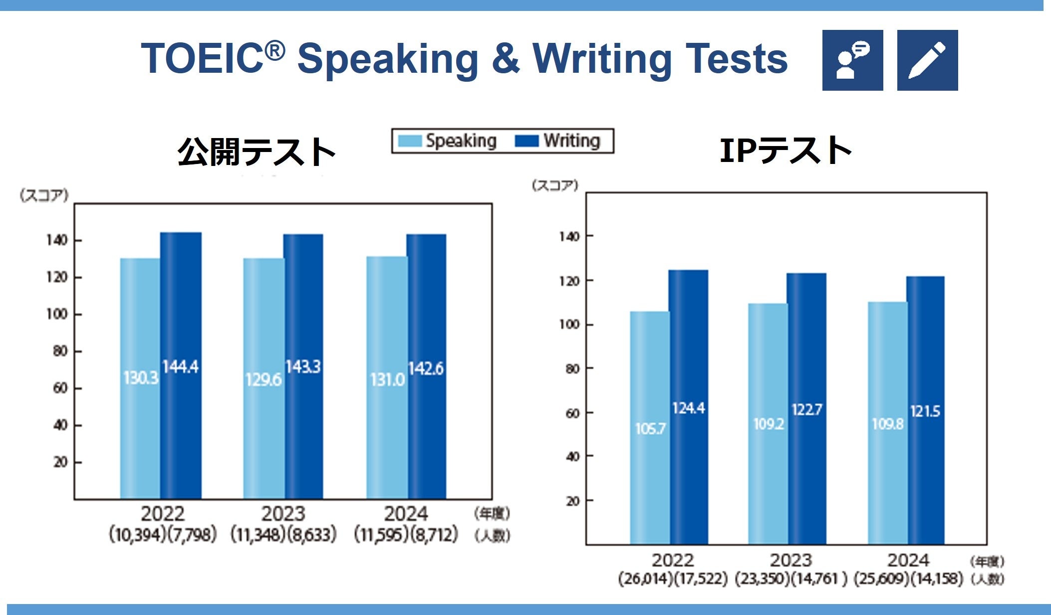 同年度のTOEIC S&Wの平均スコアは、公開テストではスピーキングが131.0点・ライティングが142.6点、IPテストではスピーキングが109.8点、ライティングが121.5点でした。