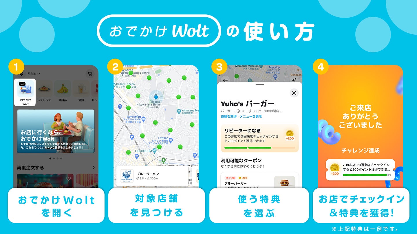 「おでかけWolt」は、お客様がWoltアプリを使って地域のお店を見つけ、実際にそのお店を訪問し、スマートフォンを店頭の専用ボードにかざすだけでWoltポイントを獲得できる新たなサービスです。ポイントを貯められるのに加え、多くのお店で提供される限定クーポンを使って、店内でのご飲食をよりお得に楽しむことができます(※)。開始時点では50か所以上のお店で利用可能です。ご利用可能な店舗は今後も増えていく予定です。