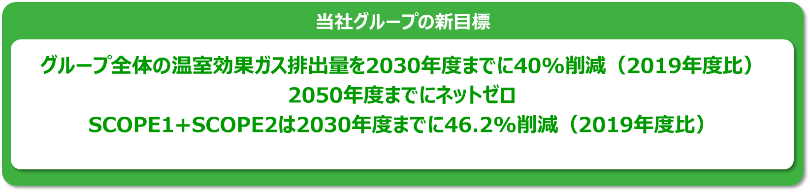 当社は、2020年12月には、当社グループの温室効果ガス排出量の2030年度と2050年度における削減目標を公表しましたが、2021年4月に政府が脱炭素に向けた新たな目標を掲げるなど、気候変動に対するグローバルな関心と対策の重要性が高まっていることを受けて、本年度に新たに策定したグループ行動計画では、2030年度の削減目標をより高く設定した新たな中期目標を掲げています。