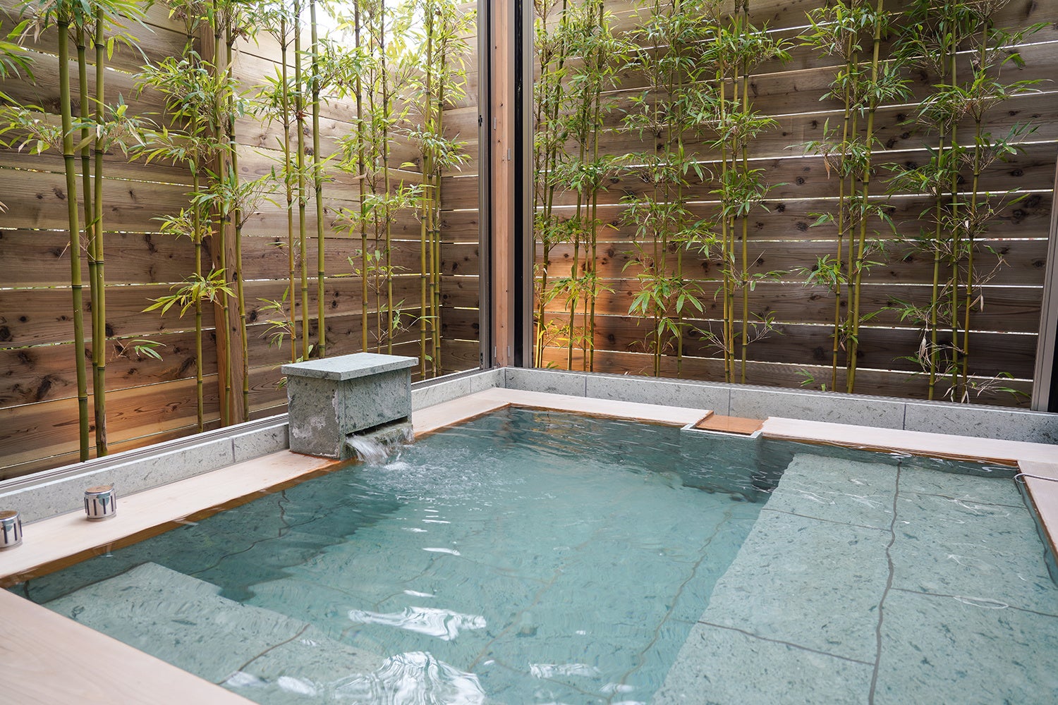 スイート客室の設備をベースに眺望抜群の天空デッキ、源泉かけ流し風呂に足湯。