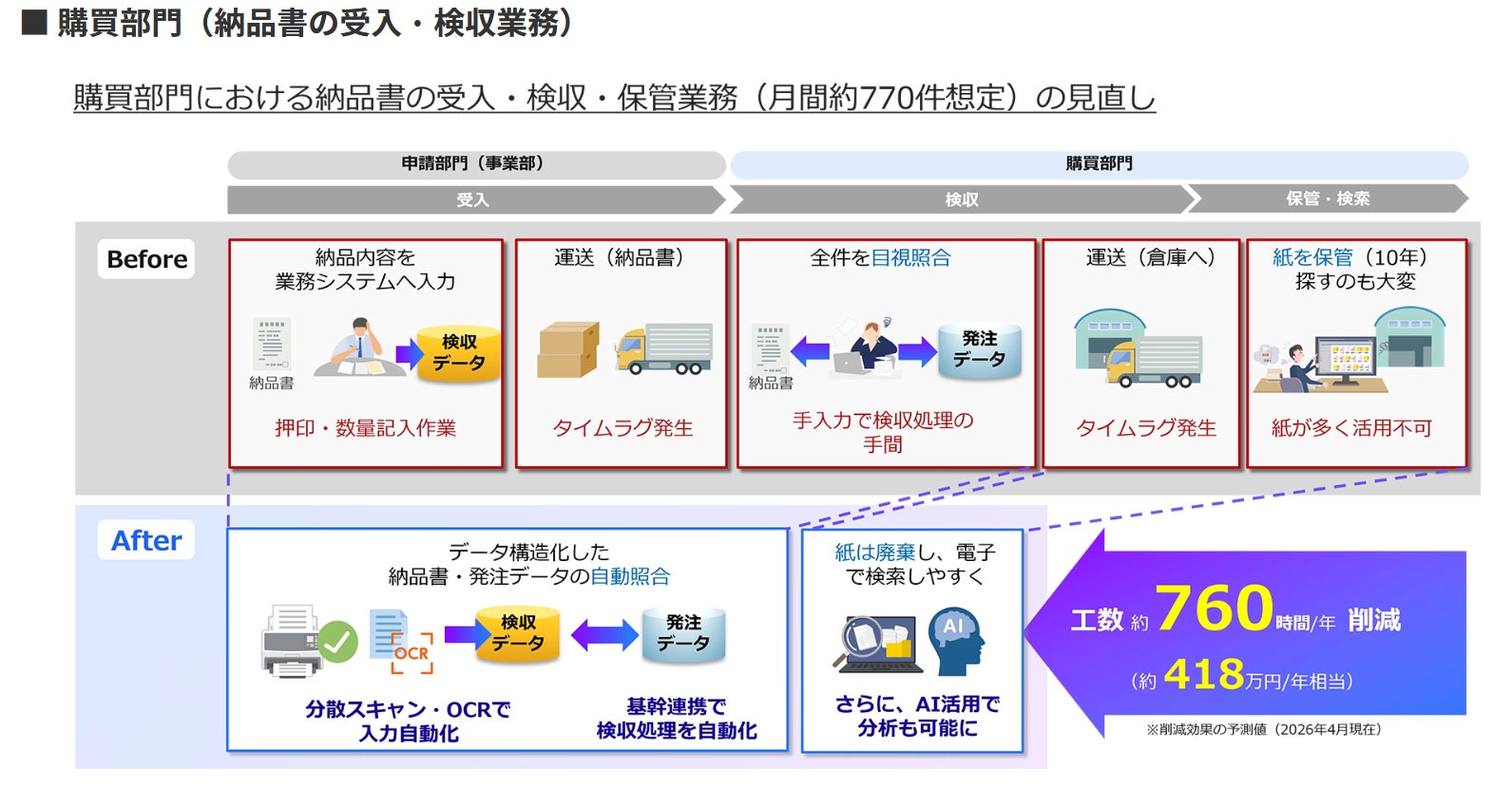 そこで、こうした課題への対応として、紙やPDFで受領した取引関連書類を、業務で活用可能なデータへ変換し、基幹システム連携することで、従来人手に依存していた入力・確認・承認プロセスの効率化とその効果見込みを検証しました。
