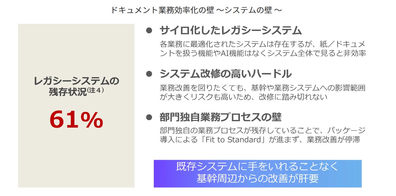 労働人口の減少や人手不足が進む中、企業のバックオフィス業務には、これまで以上の効率化が求められています。しかし多くの現場は今もなお、紙・FAXが数多く残り、手入力や目視確認といった非効率な作業が続いています。また、多くの企業において生成AIの導入は進む一方、用途は議事録作成や情報整理など限定的な活用にとどまっています。その背景には、紙・FAXに加えPDFや画像も含めた文書情報が業務やシステムで扱いやすいデータになっていないこと、および、レガシーな既存システムの改修ハードルが高いことが挙げられます。