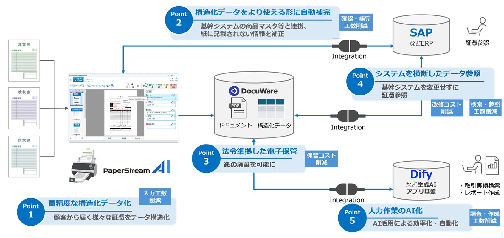 前述のサービスの中核となる新AI-OCR「PaperStream AI」を起点に、紙文書のデータ化から既存システム連携、AI活用までを一気通貫で実現する価値の全体像です。