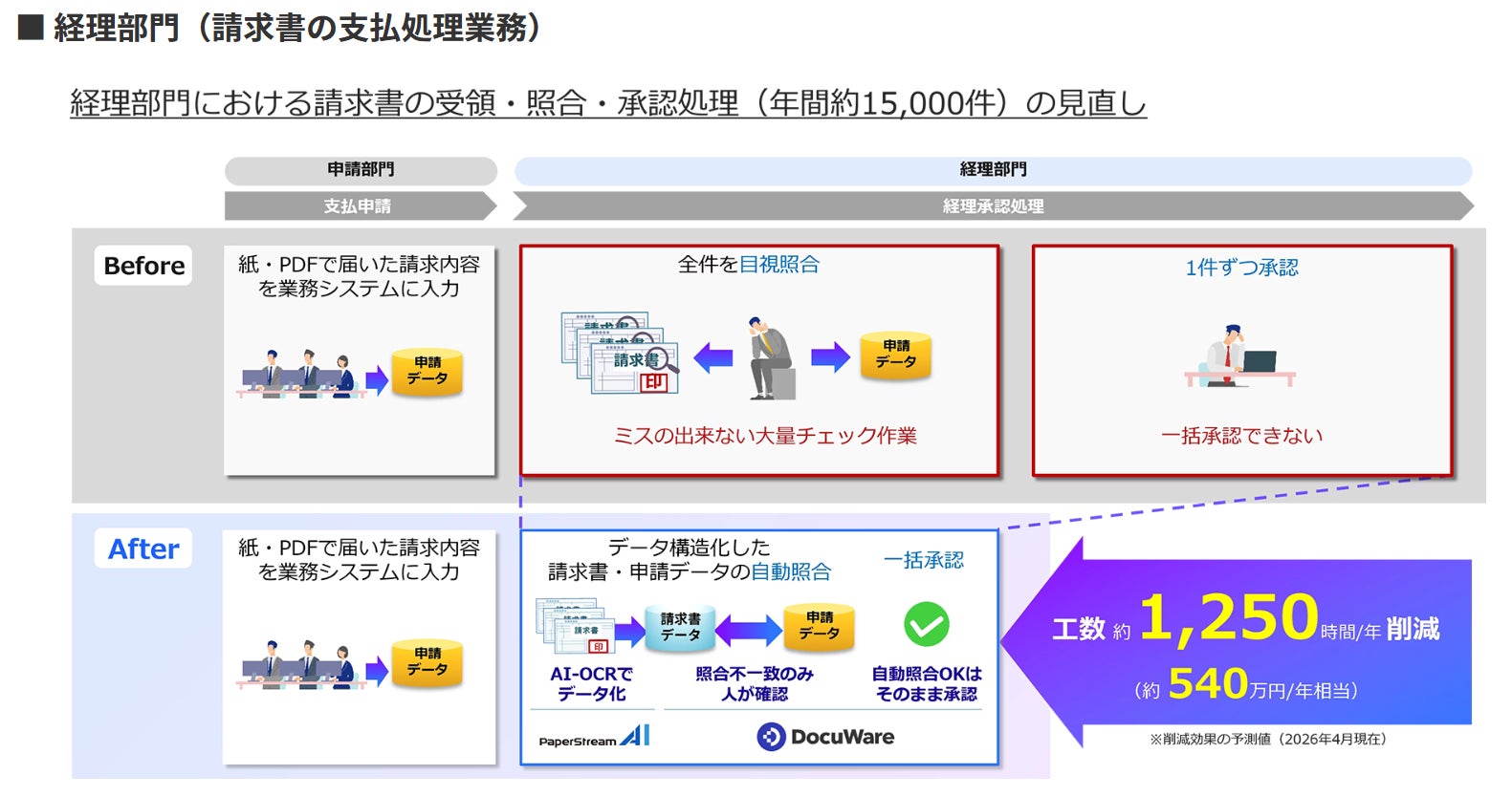 ※本PoCは数百件程度の実際の書類データを用いた初期評価段階です。本PoCに記載の削減効果は、一定の前提条件に基づく予測値であり、実測値ではありません。実際に導入した場合の効果は、お客様の利用環境、運用条件等により異なるため、当該予測値と同様の効果を保証するものではありません。