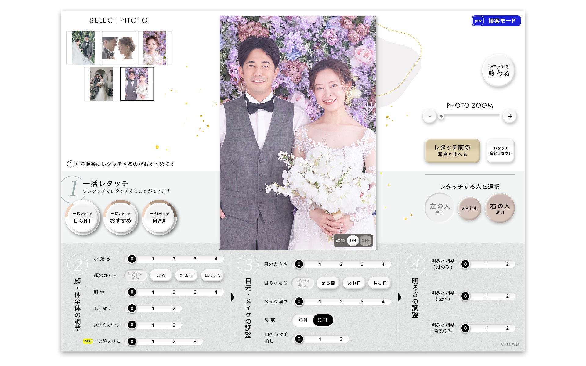 プリントシール機シェアNo.1企業*であるフリュー株式会社が開発したレタッチソフト「FURYU retouch」のエンジンを採用。若い世代に馴染みのあるプリントシール機の画面のような分かりやすい操作性で、様々なレタッチをお客様ご自身で調整ができ、気になるパーツや人に伝えづらい、細部な箇所もご自身でイメージ通りに仕上げることが可能になりました。 写真スタジオ専用に開発されたシステムは、自然な仕上がりを叶える、「1944万通り」のカスタマイズが魅力。「肌質」「顔のかたち」「スタイルアップ」「二の腕スリム」など、機能によっては最大5段階の調整レベルを選択でき、ナチュラルで美しい仕上がりを実現します。 *2022年夏フリュー調べ