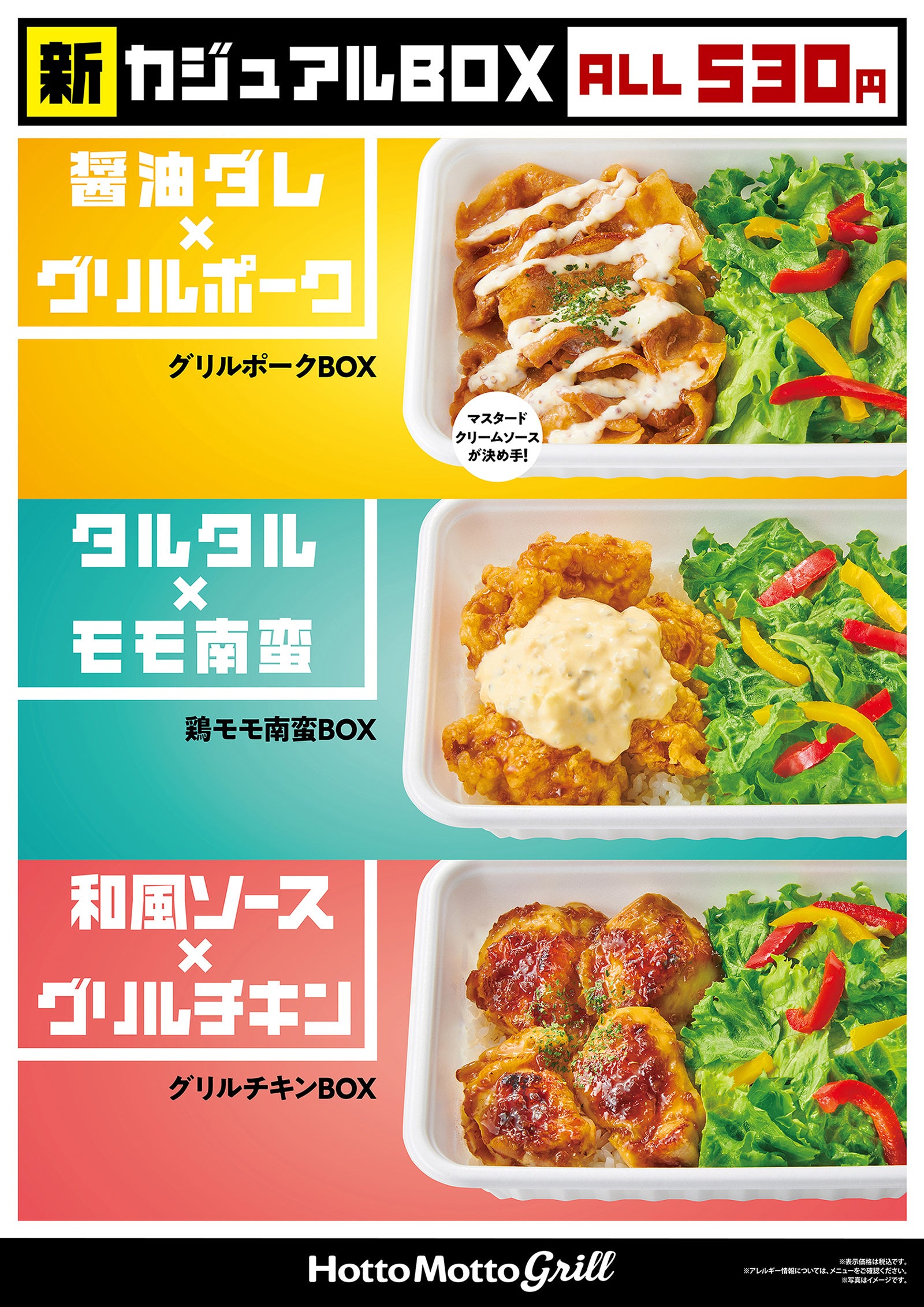 ランチタイムにおすすめのメニューが登場「ほっともっとグリル」の商品をお手頃価格で楽しむ『グリルポークBOX』『鶏モモ南蛮BOX』『グリルチキンBOX』各530円