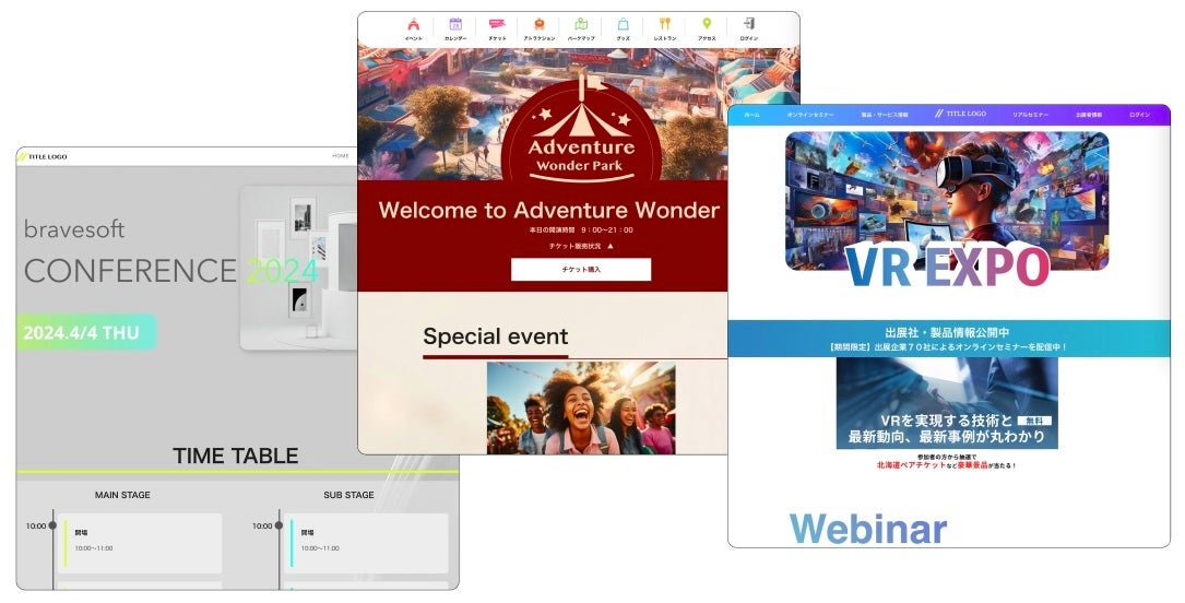 Japan Mobility Show、DX総合EXPO(以上、展示会)、CHANGE TO HOPE、updataNOW、Conference-X(以上、カンファレンス)、横浜八景島シーパラダイス(以上、レジャー施設)など7000を超えるイベントで活用されているeventosの経験やノウハウを凝縮したテンプレートになっています。