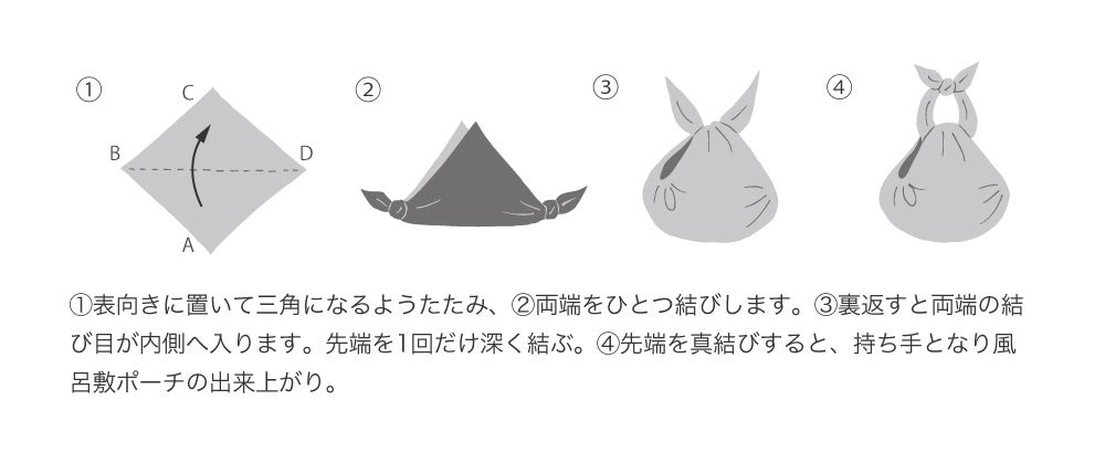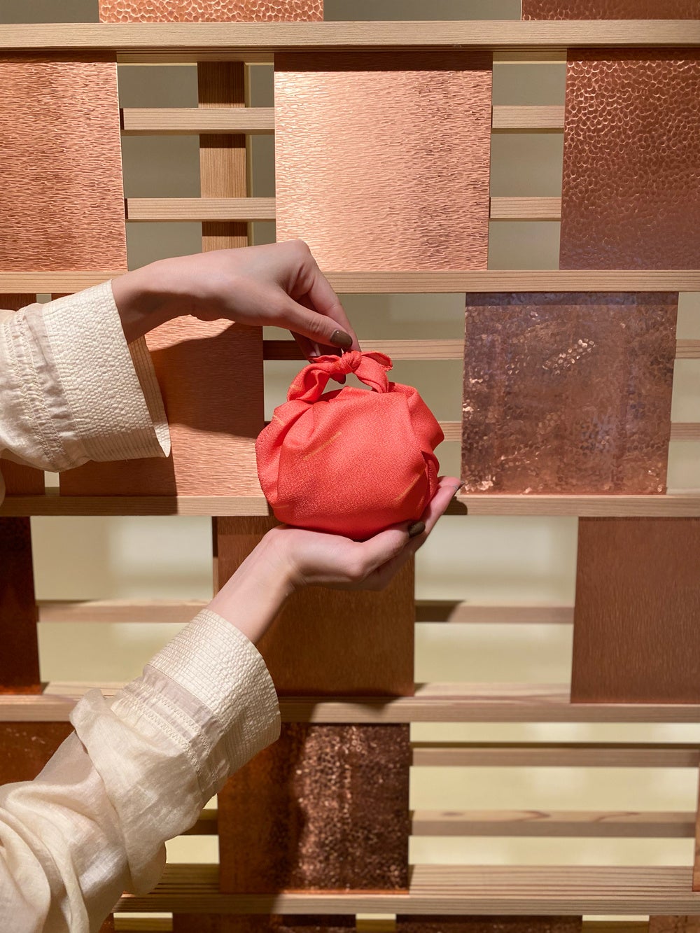 風呂敷の伝統的な結び方である「真結び」と「縦結び」を組合せ、ハンドクリームが入るサイズのポーチの形に結んでお渡しします。そのままポーチとしてお使いいただいても、別の結び方で様々なものを包んでも、お客さまの自由な使い方でご利用いただけます。