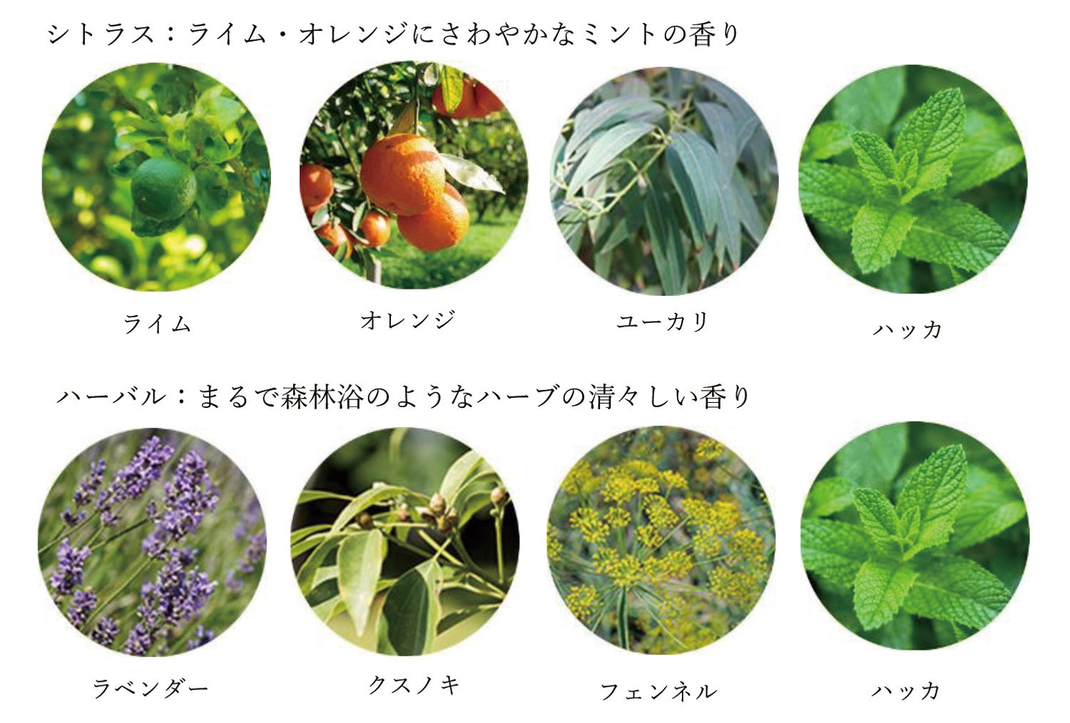 天然精油をブレンドした香りは、フレッシュなライム・オレンジにさわやかなミントの香りがアクセントの「シトラス」、樹木とハーブがおりなすまるで森林浴のような香りが清々しい「ハーバル」の2種を用意。天然精油の優しい香りが生活に癒しを与え、気分をリフレッシュさせてくれます。
