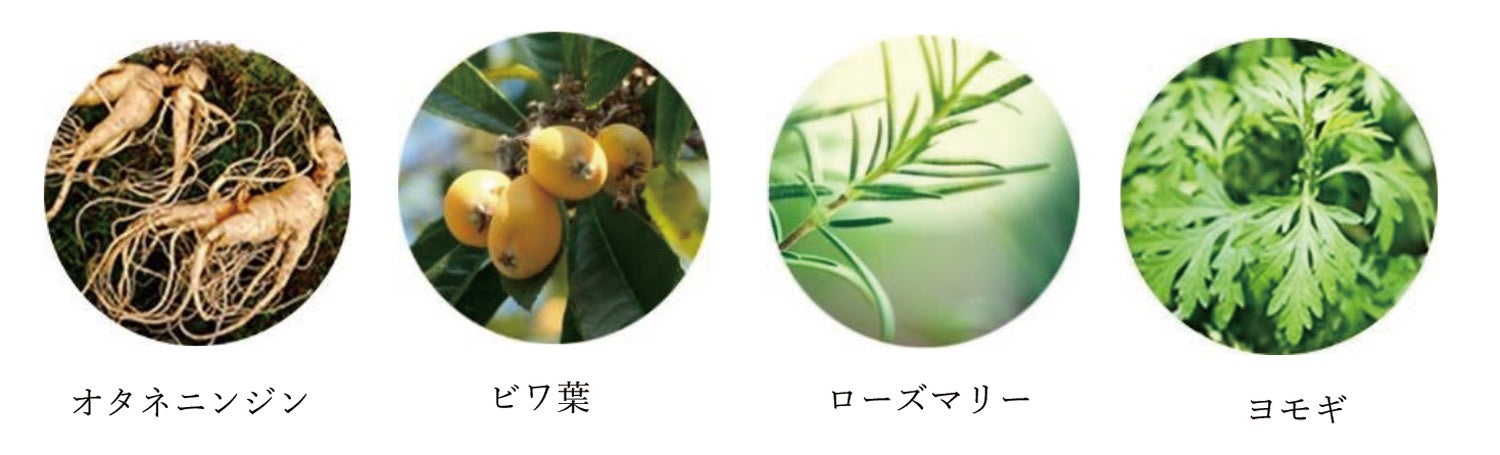ハーバル:水 、ベヘニルアルコール 、ホホバ種子油 、ヤシ脂肪酸グリセリル 、ヒマワリ種子油 、スクワラン 、オタネニンジン花/葉/茎エキス 、オタネニンジン根エキス 、ローズマリー葉エキス 、ビワ葉エキス 、ヨモギ葉エキス 、カミツレ花エキス 、ヒアルロン酸Na 、酵母エキス 、ラベンダー油 、クスノキ葉油 、オレンジ油、ウイキョウ果実油 、キトサン 、ハッカ葉油 、ユーカリ葉油、フィチン酸、アルギニン、褐藻エキス 、加水分解コラーゲン、トコフェロール、酸化銀