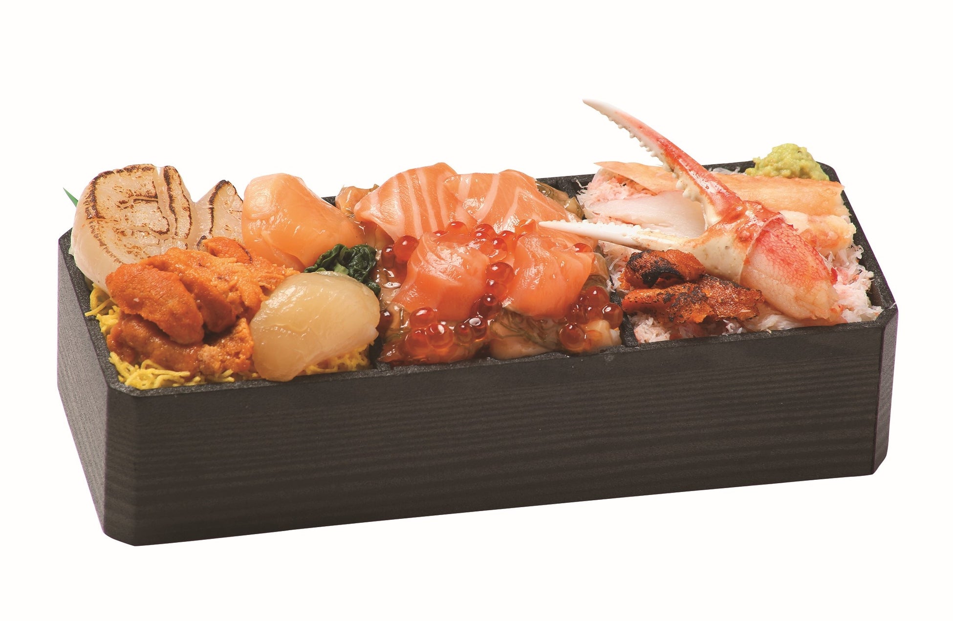 旭川での駅弁立売販売がはじまりの弁当店。北海道産のウニ、イクラ、ホタテを使用し、さらに本マグロの中トロ、カニフレークを盛り付けました。
