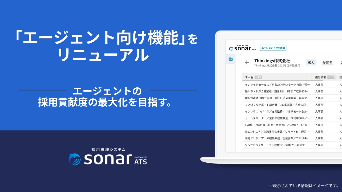 組織づくりのプラットフォーム「sonar HRテクノロジー」を展開するThinkings株式会社(シンキングス、本社:東京都中央区、代表取締役社長:吉田 崇)は、提供する「採用管理システムsonar ATS( https://hr.sonar-ats.jp/20241119_agent )」の新卒・中途採用における「エージェント向け機能」をリニューアルしました。今回のリニューアルで、候補者の推薦や採用担当者とのコミュニケーションといった業務を効率化し、エージェントの採用貢献度の最大化を目指します。