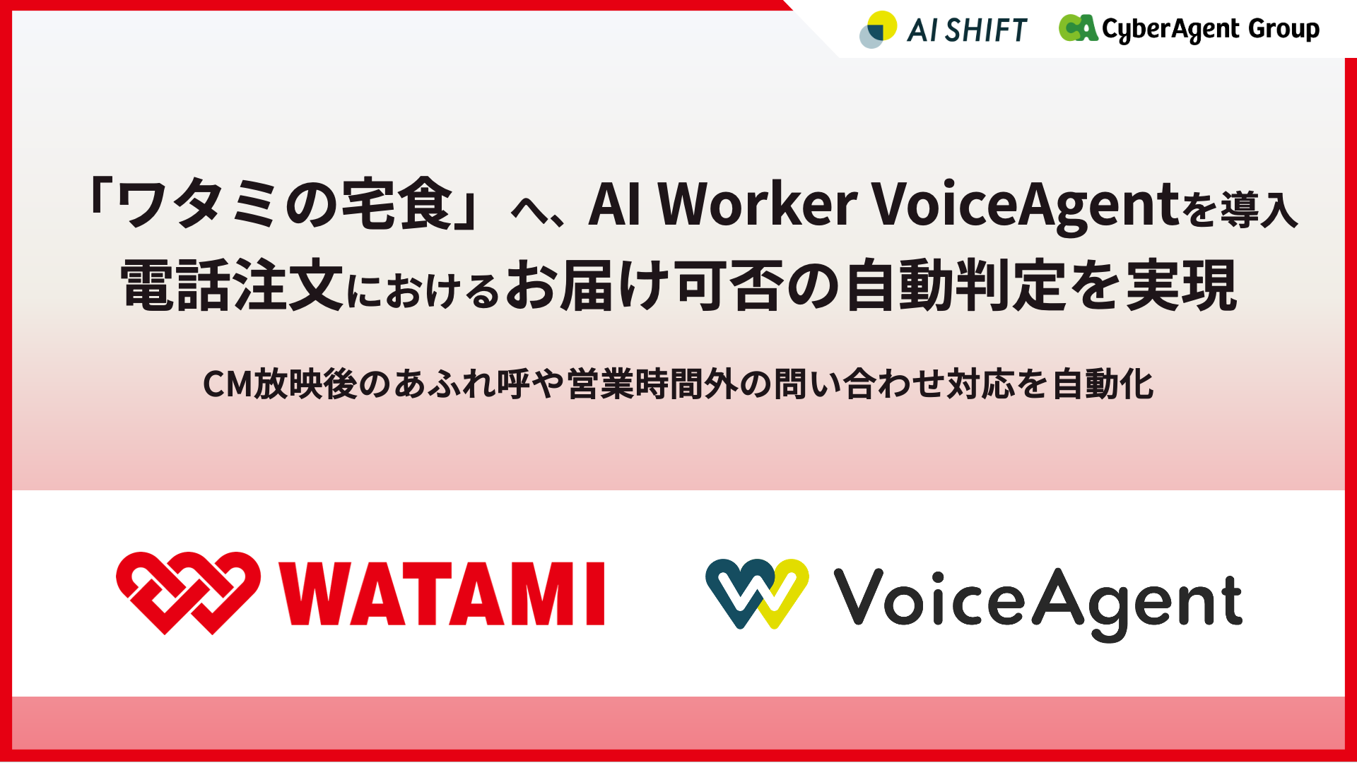 株式会社AI Shift(本社:東京都渋谷区、代表取締役社長:米山結人、以下 AI Shift)は、ワタミ株式会社(本社:東京都大田区、代表取締役会長 兼 社長 CEO 渡邉 美樹、以下ワタミ)が展開するサービス「ワタミの宅食」において、電話対応を担う音声AIエージェント「AI Worker VoiceAgent」が導入されたことをお知らせします。