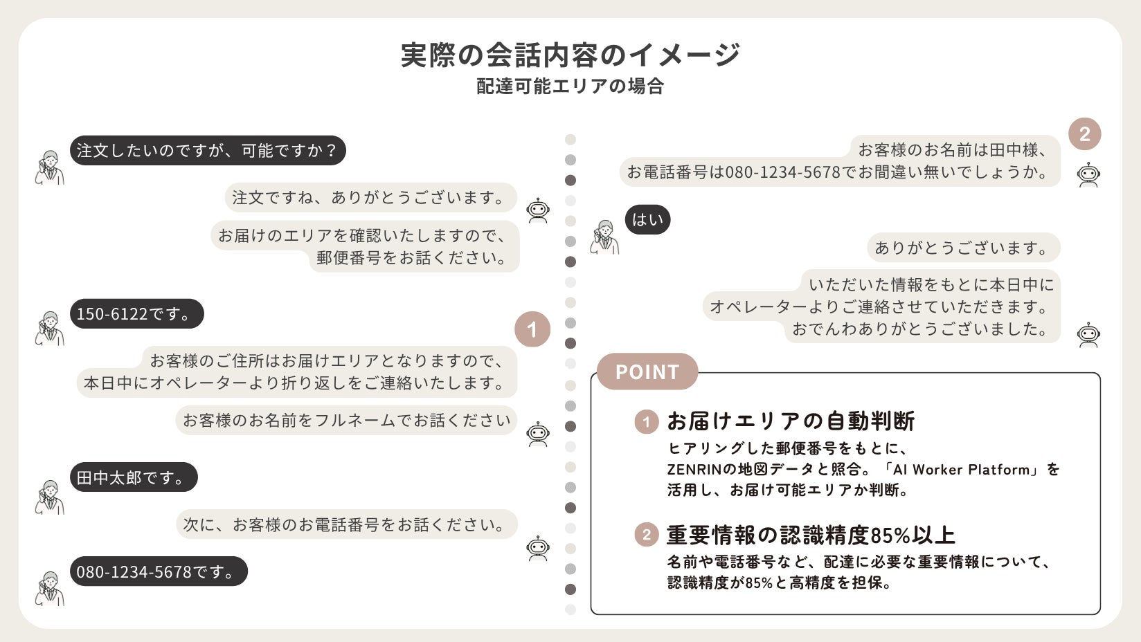 本サービスは、ZENRIN Maps APIと連携しており、ZENRINの住所データを活用して住所を特定する機能を備えています。これにより、郵便番号からお届け可能エリアかどうかを自動で判断することができます。また、その結果に応じて案内内容を切り替えることも可能です。さらに、電話番号・郵便番号・氏名などの重要な情報を高い精度で認識できるため、注文受付に必要な情報取得を安定して行える点が評価されました。
