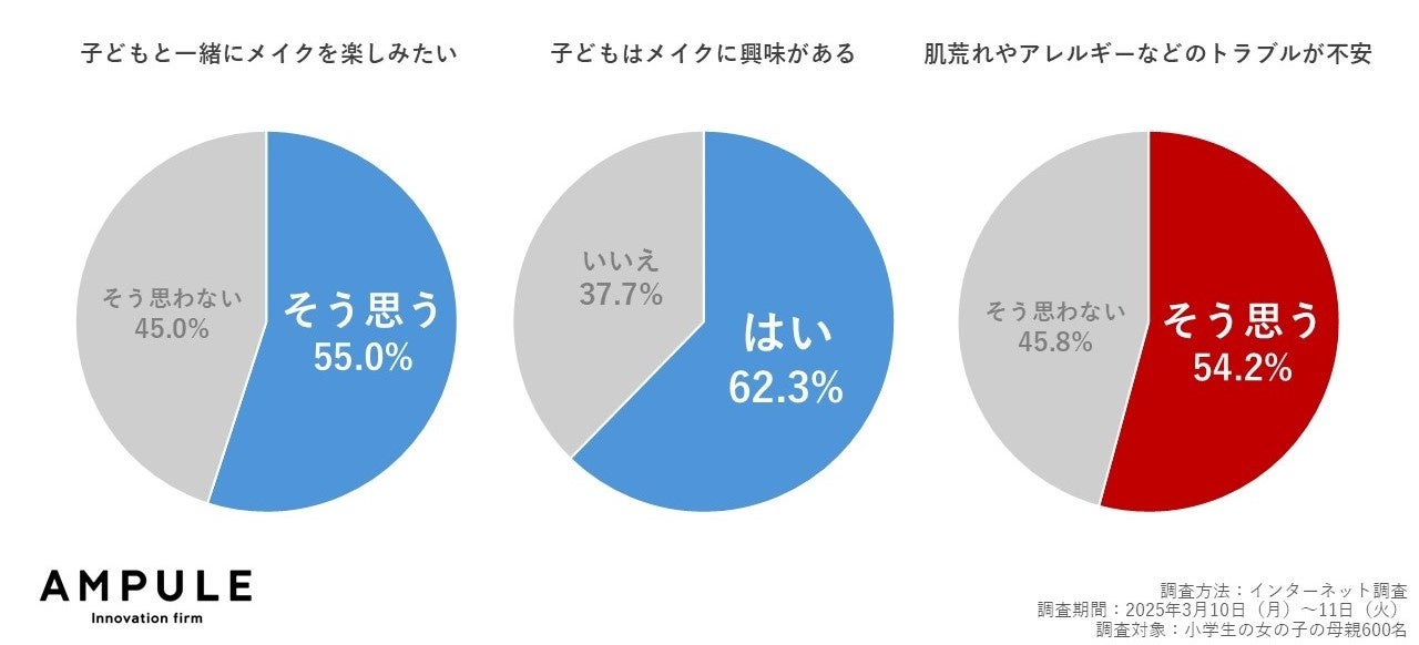 近年、スマホやSNSの普及によって、子どもがメイクに触れるタイミングが早期化しています。ampuleが実施した調査(※)では、小学生の女の子の母親のうち6割以上(62.3%)が「(自身の子どもは)メイクに興味がある」と回答。母親自身も半数以上(55.0%)が「子どもと一緒にメイクを楽しみたい」と回答しています。その一方で、半数以上(54.2%)の母親が「肌荒れやアレルギーなどのトラブルが不安」と回答するなど、成長途上の肌にメイクを施すことへの不安の声も多く聞こえます。このような状況のため、子どものメイクへの興味を否定するのではなく、その気持ちを理解したうえで、大人が子どもと一緒に正しい美容の知識を学ぶことが重要です。そして、その重要性はさらに高まっていくとampuleでは考えています。