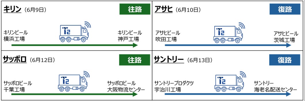 本実証には、キリングループロジスティクス株式会社(本社 東京、社長 小林信弥)、サッポログループ物流株式会社(本社 東京、社長 服部祐樹)、サントリーロジスティクス株式会社(本社 東京、社長 髙橋範州)の酒類・飲料の物流子会社3社も参画(以下、アサヒロジとあわせて「4社」)します。4社は関東から関西までの高速道路の往復路で製品の容器・重量を変えてそれぞれが幹線輸送し、自動運転トラックによる輸送の有効性と具体的なオペレーションをT2と検証します。